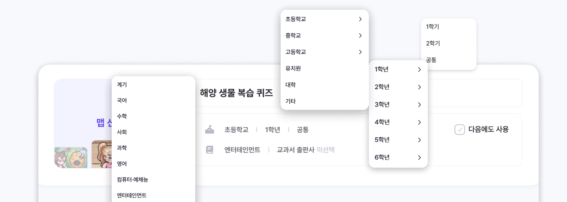 이제 퀴즈를 만들 때 학교급, 학년, 학기, 교과서 출판사 등의 교육 과정 정보를 입력할 수 있습니다.