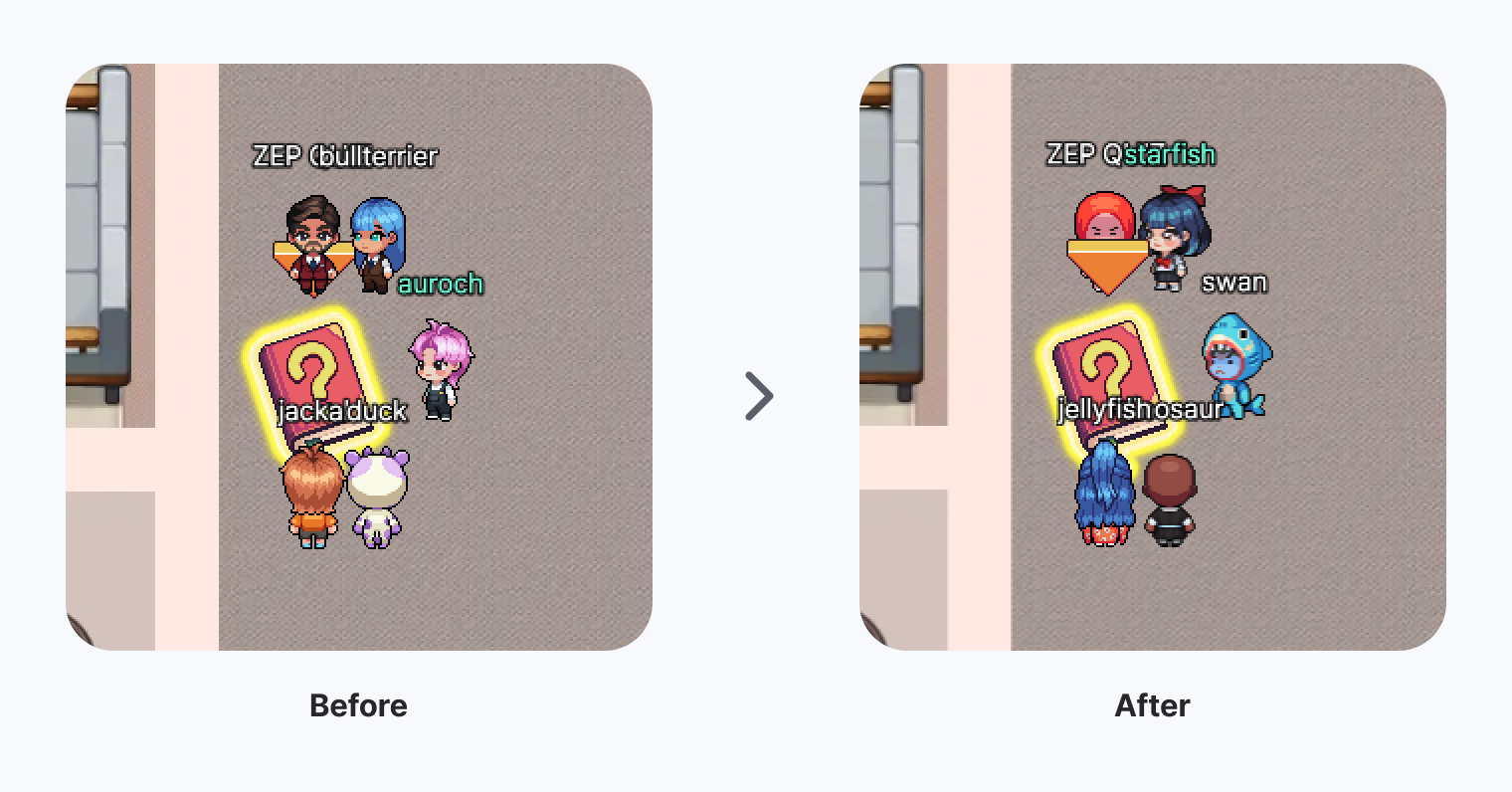이제 문제 오브젝트를 더 쉽게 찾을 수 있도록, 문제 오브젝트의 위치를 알려주는 화살표가 아바타보다 위로 노출됩니다. 퀴즈 진행 중, 문제를 더 빠르게 찾아서 해결해보세요!