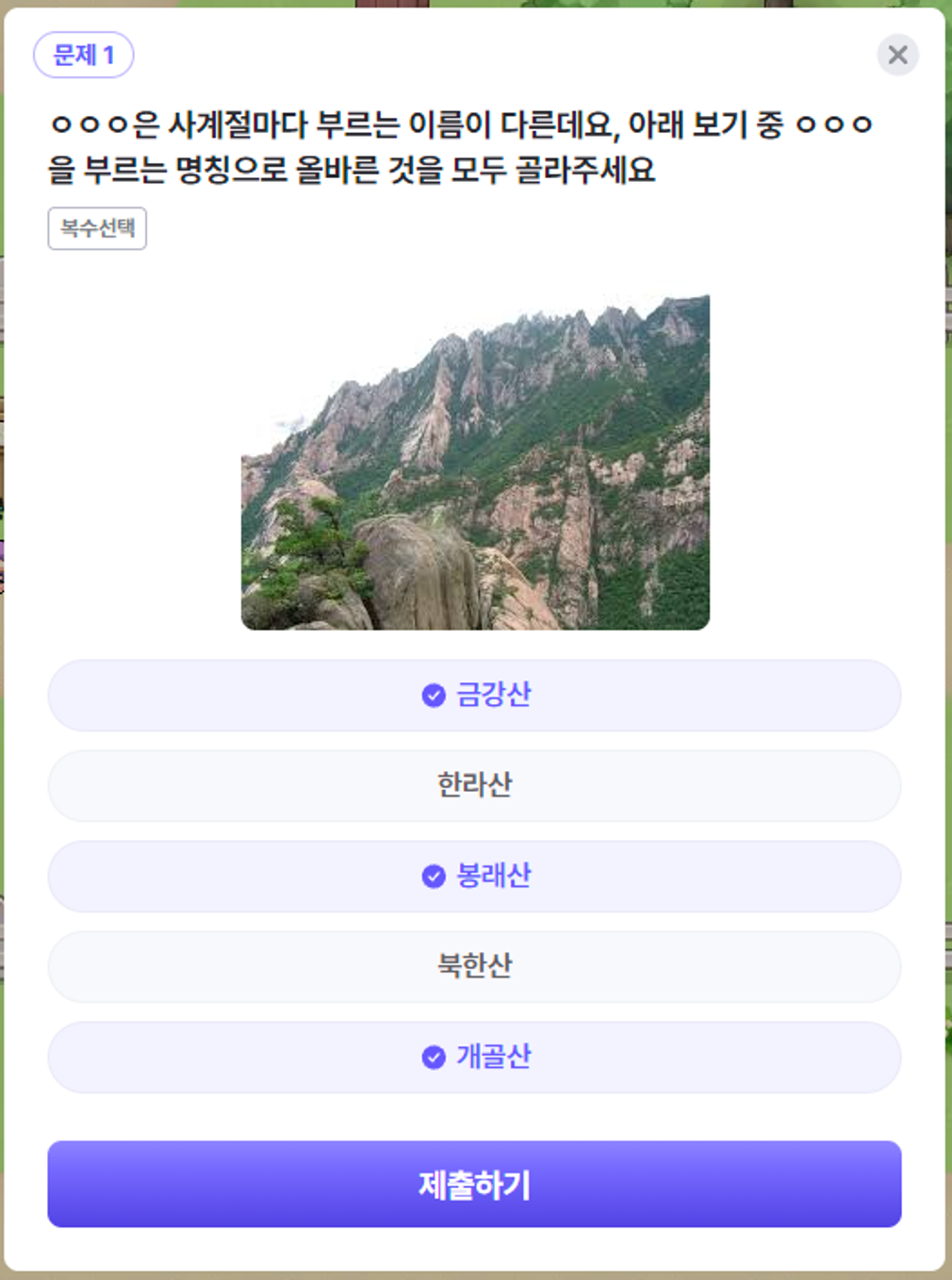 정답이 여러 개로 설정된 문제는, 학생들이 풀 때 위와 같이 선택지를 여러개 입력해서 제출할 수 있습니다.