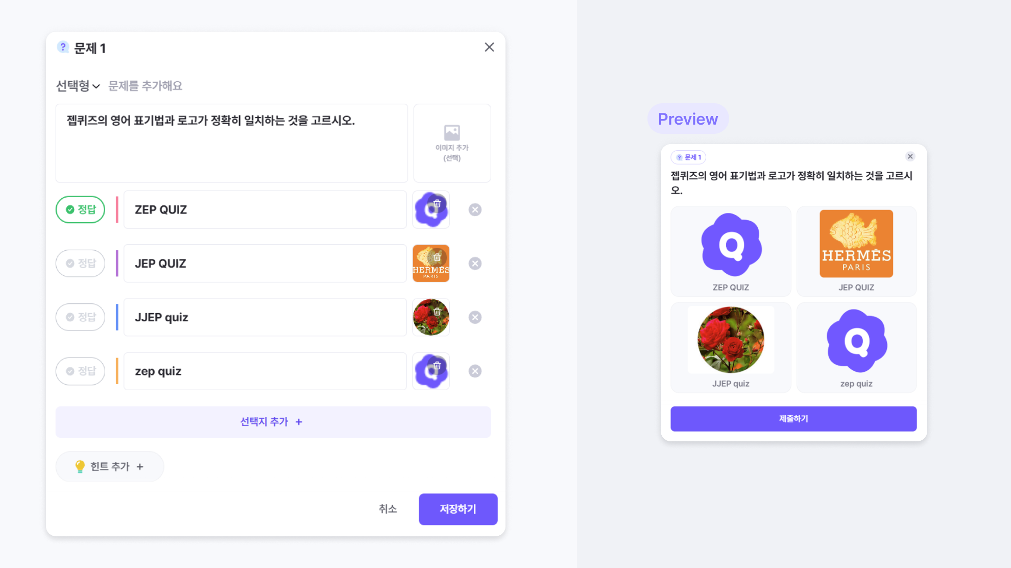 이미지와 함께 보다 직관적인 퀴즈를 구성할 수 있어, 시각적 요소를 활용한 퀴즈를 만들 수 있습니다.