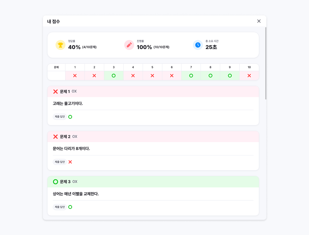 퀴즈 풀이가 완료되면, 맞춘 문제, 걸린 시간, 내 순위를 한 눈에 확인할 수 있습니다.