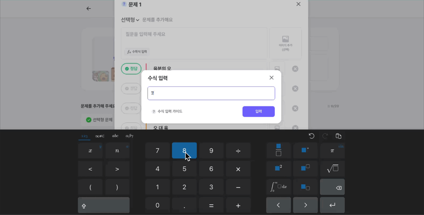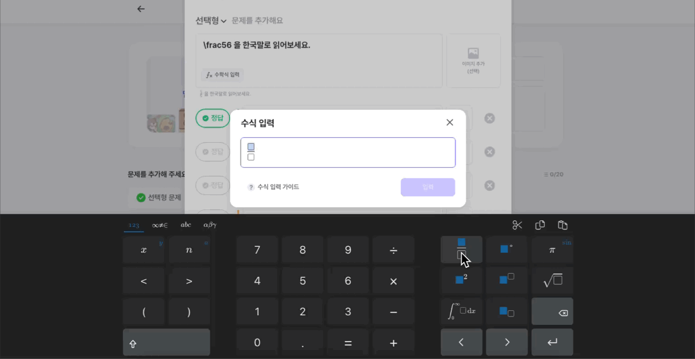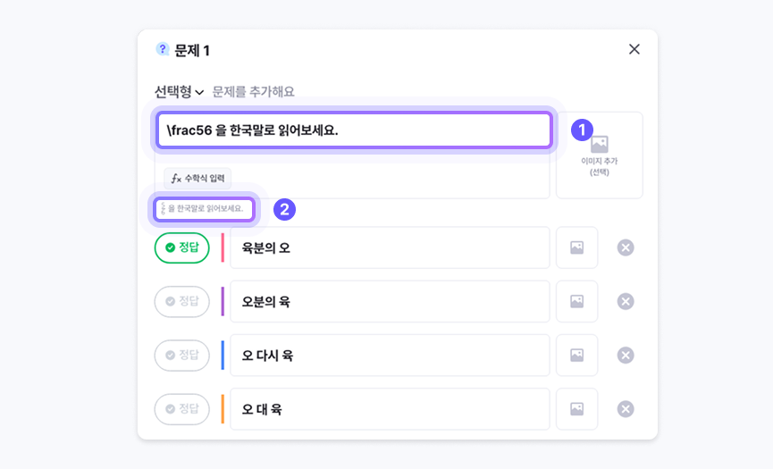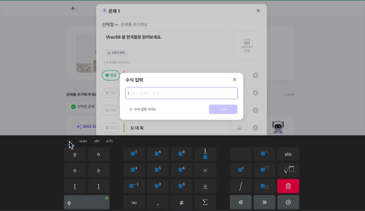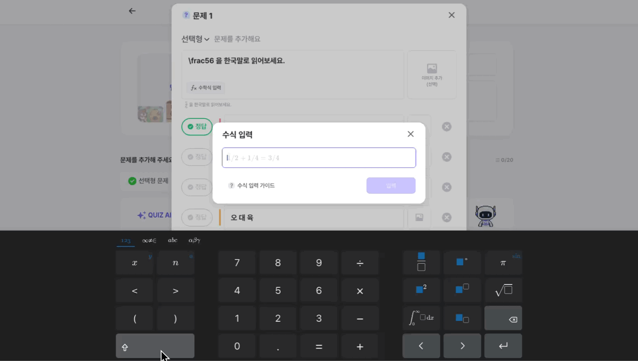 수식이 포함된 문제의 경우, 실제 퀴즈 플레이 창에 노출될 최종 형태를 미리 확인할 수 있습니다.
