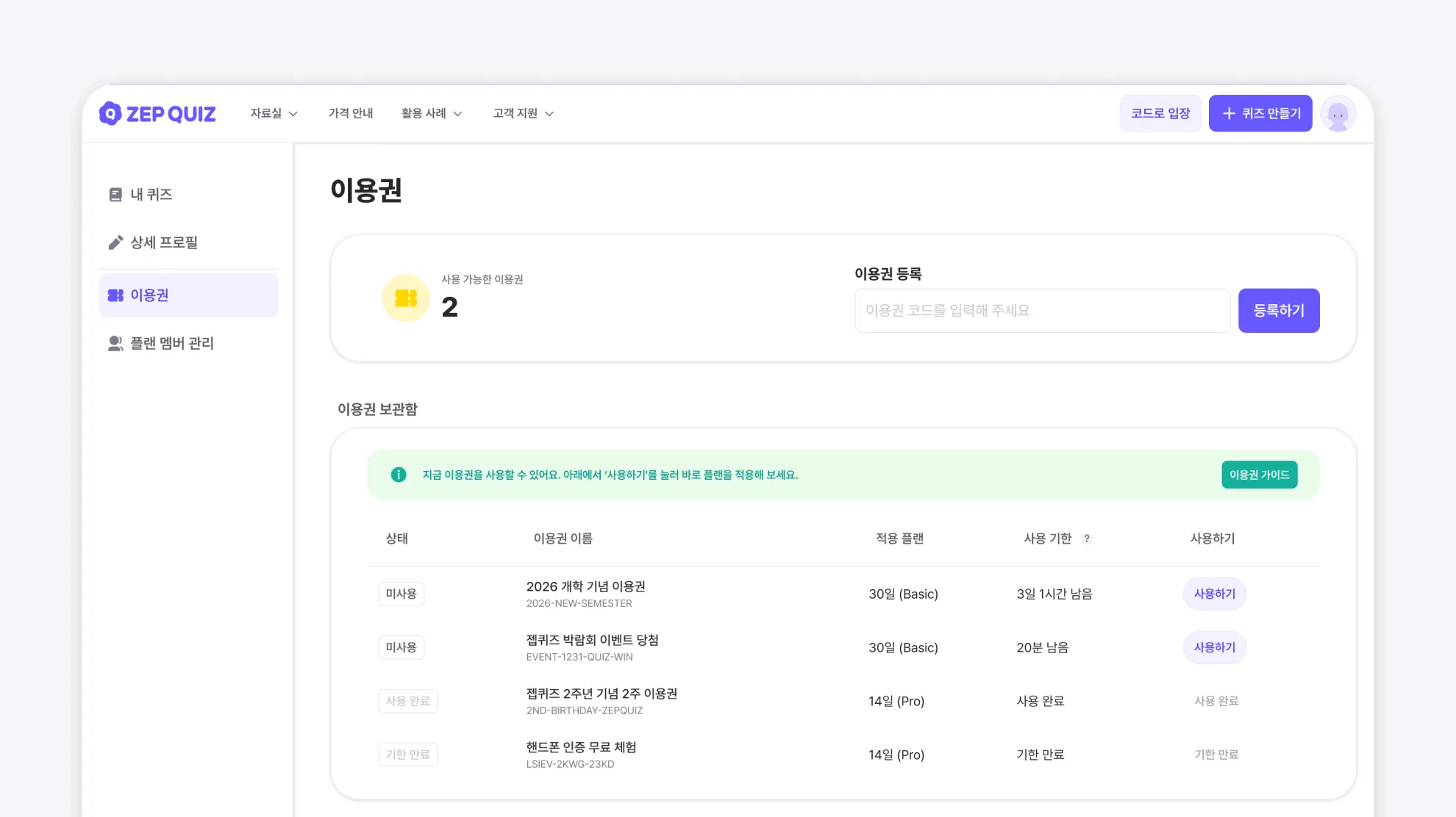 이용권은 ZEP QUIZ의 프리미엄 플랜을 정해진 기간 동안 사용할 수 있게 해주는 등록형 코드입니다.
