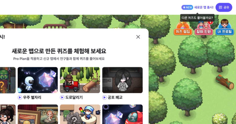 퀴즈 플레이화면 우측 상단에 '새 맵으로 만든 튜토리얼 퀴즈룸 목록'을 띄워 새로운 맵을 빠르게 체험해보실 수 있도록 개선했습니다.