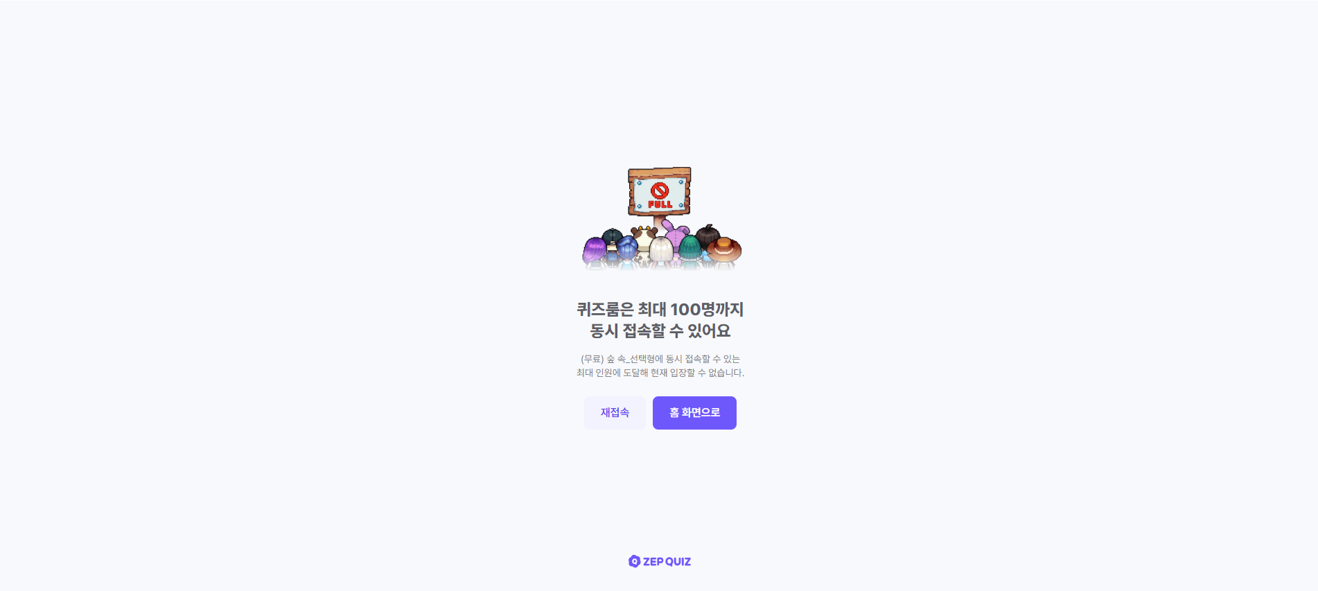 100명을 초과할 경우, 101명째 참여 인원부터 안내 페이지로 이동되며, [재접속] 또는 [홈 화면으로] 이동할 수 있습니다.
