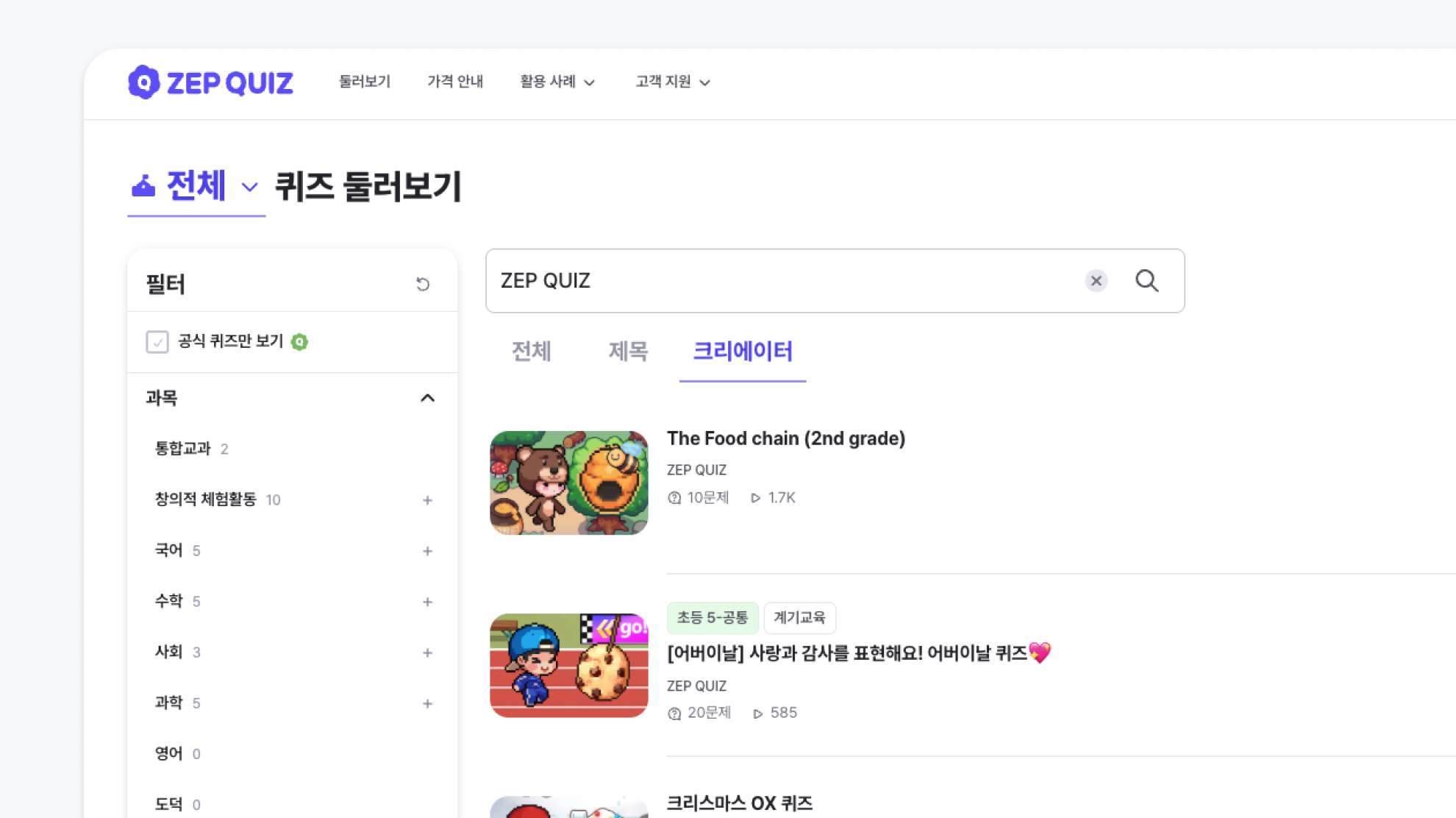 검색 결과에서는 퀴즈 제목과 함께 크리에이터의 닉네임도 확인할 수 있어요.