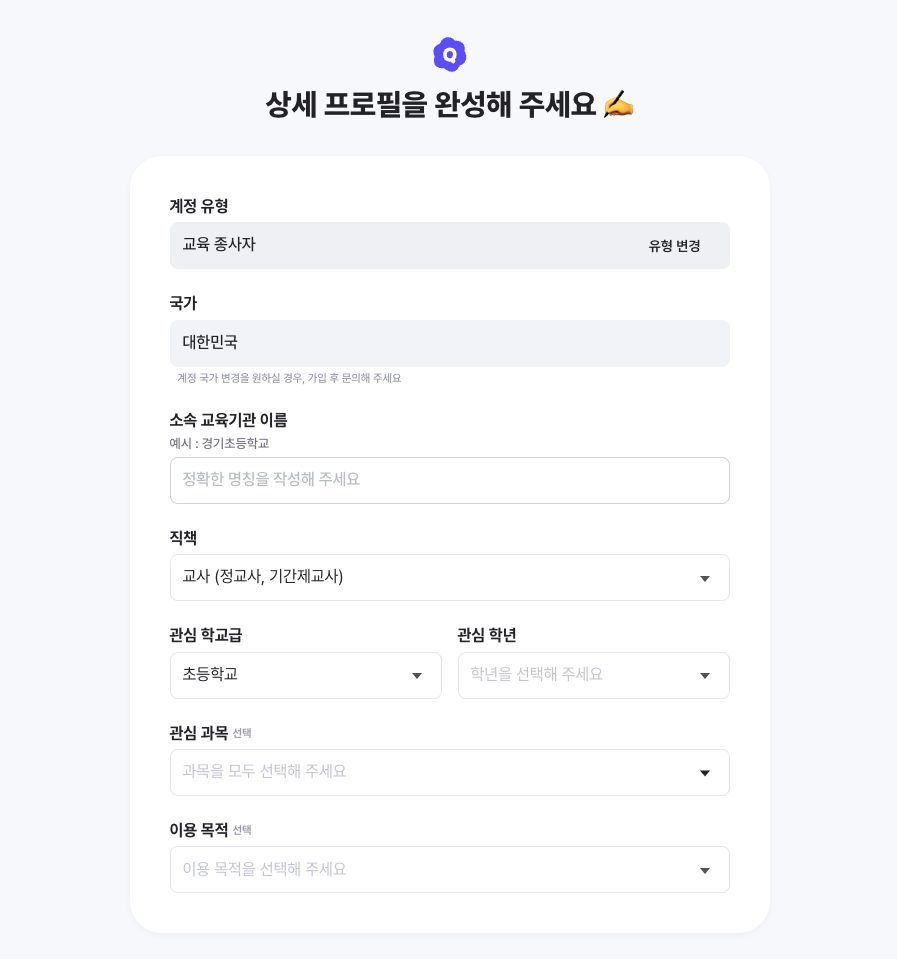 이미 가입하신 기존 사용자분들도 프로필 입력을 완료해주셔야 ZEP QUIZ 서비스를 사용하실 수 있습니다.
