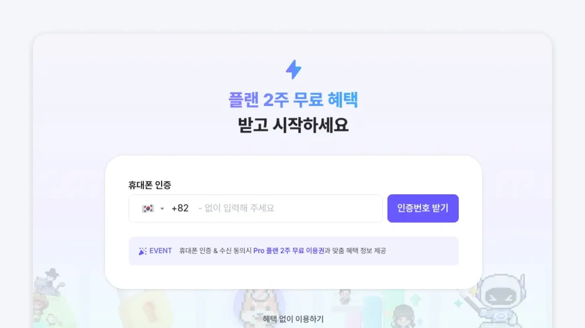 이미 회원가입 후 무료 체험을 이용하신 경우에도, 휴대폰 인증을 완료하시면 Pro 플랜 2주 이용권을 받으실 수 있습니다.