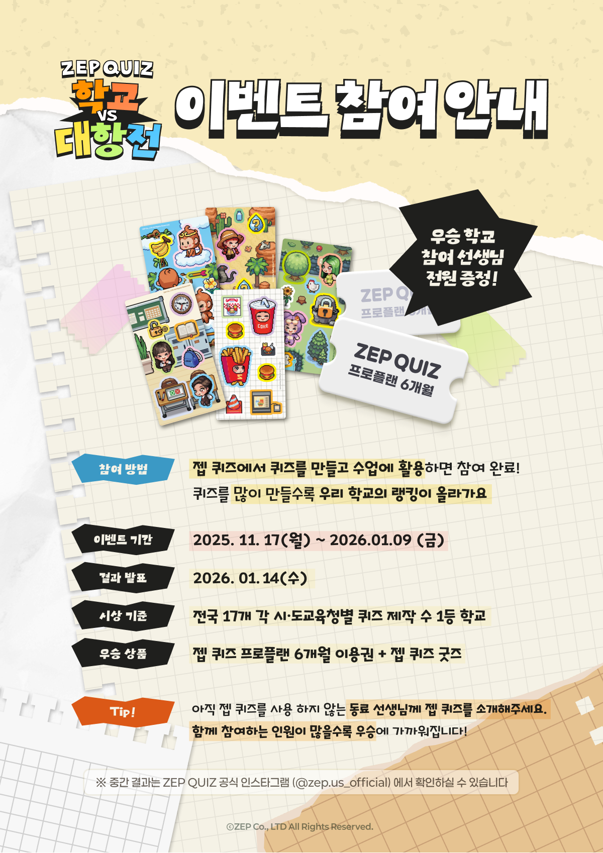 젭 퀴즈에서 새 퀴즈를 만들어 수업에 활용해보세요. 이벤트 기간(2025.11.17~2026.01.09) 동안 생성된 퀴즈 수를 기준으로 학교별 순위가 결정됩니다.