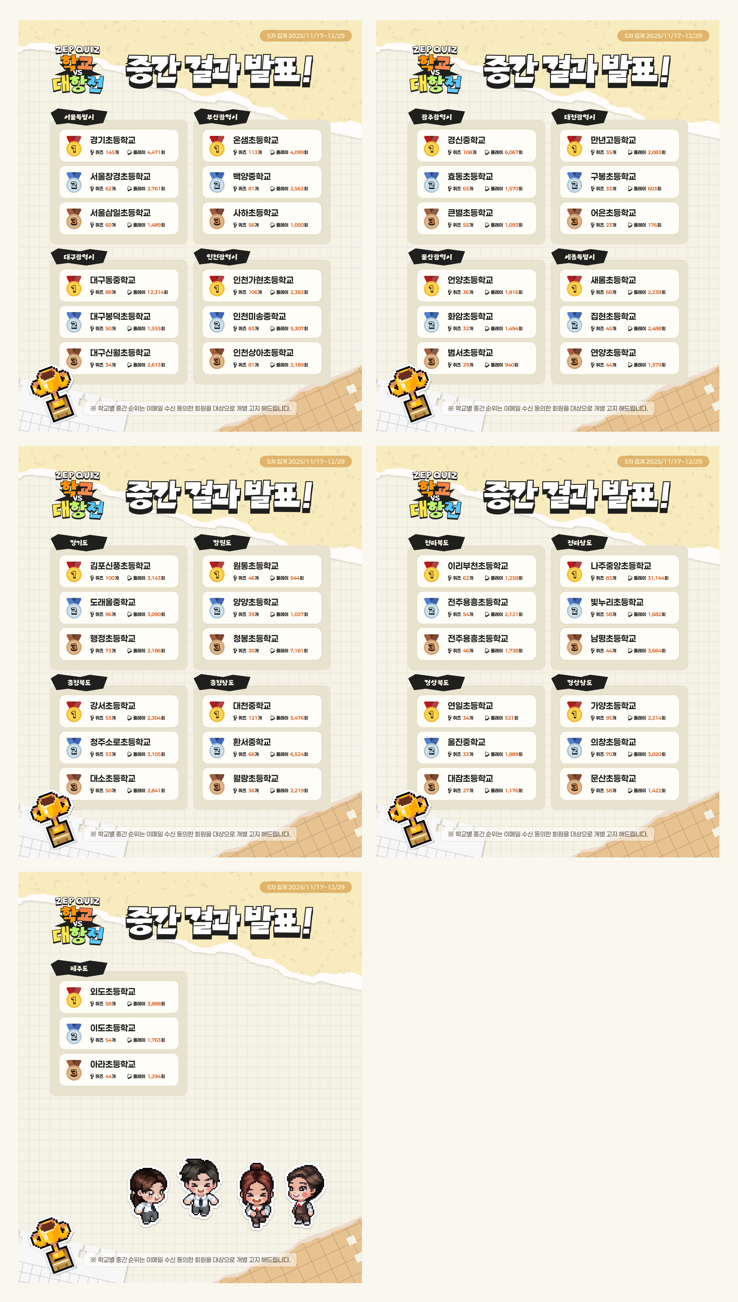 같은 학교명으로 가입한 선생님들의 퀴즈가 합산되어 학교별 순위가 자동으로 집계됩니다. 현재는 학교명 확인 및 수정 기능이 제공되지 않으나, 해당 기능은 12월 중 업데이트될 예정입니다.