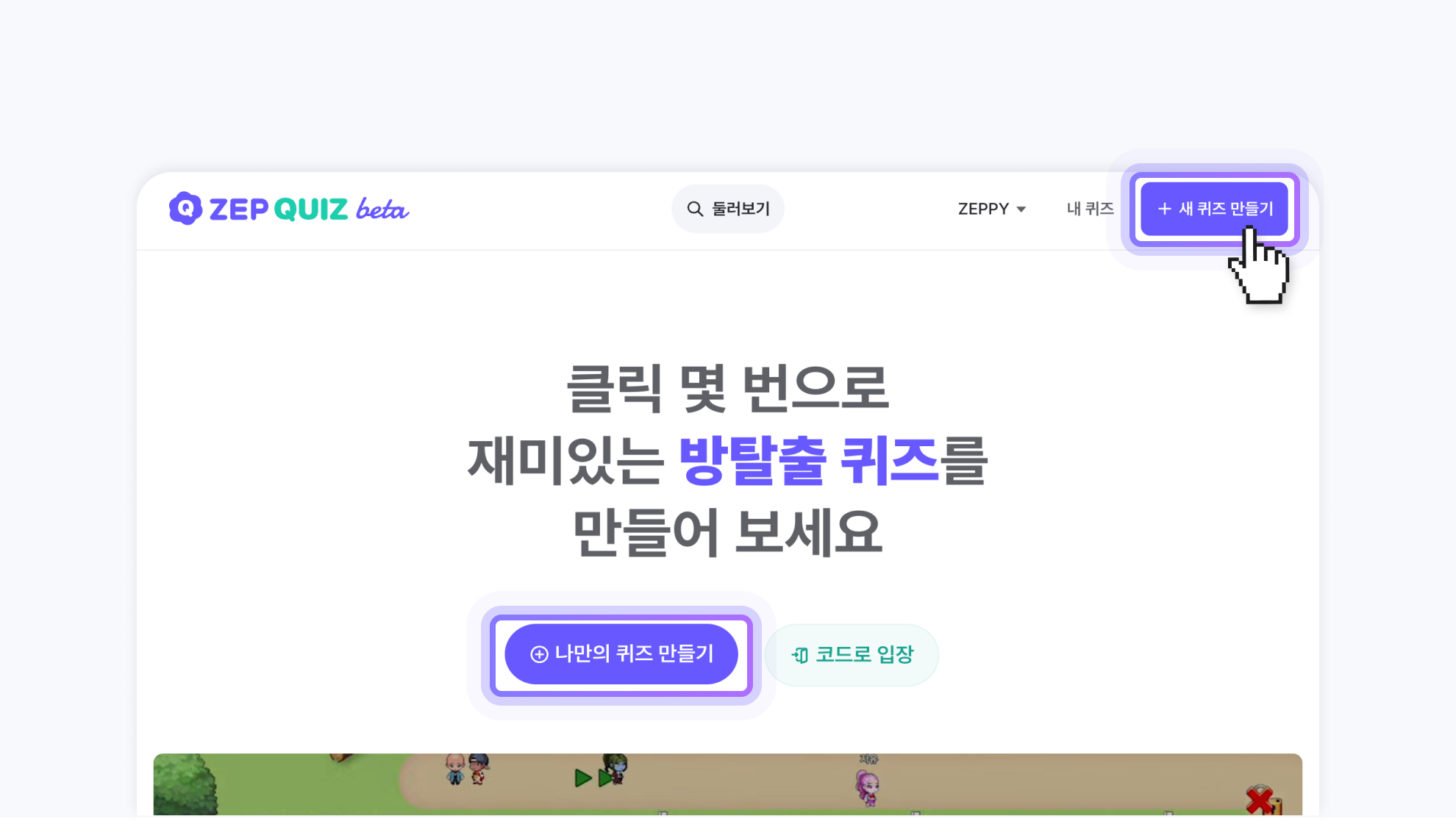ZEP QUIZ에 로그인한 후 + 새 퀴즈 만들기 또는 + 나만의 퀴즈 만들기 버튼을 클릭하세요.