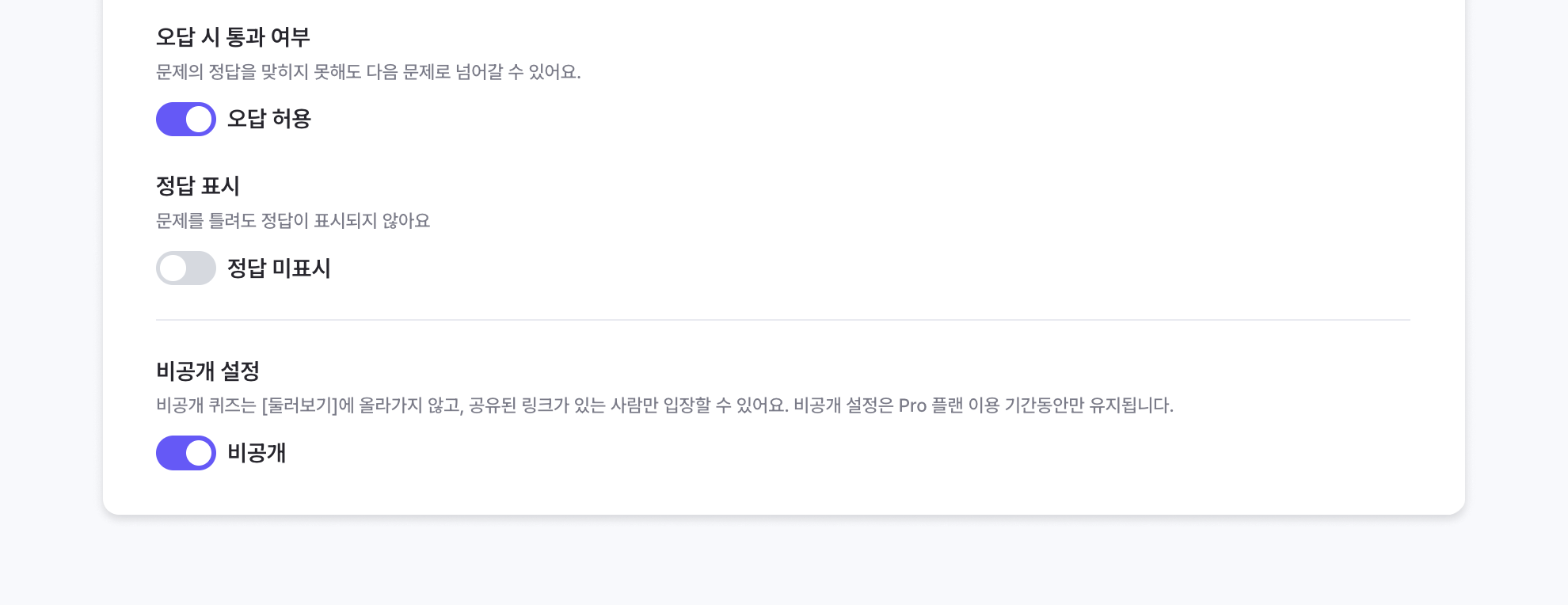 학급 내에서만 퀴즈를 운영하고 싶다면 Premium Plan의 비공개 설정 기능을 이용해보세요.