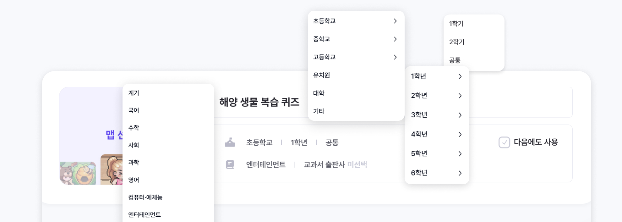 교육과정 정보를 통해 퀴즈 자료실에서 더욱 편리하게 퀴즈를 탐색할 수 있도록 빠른 시일 내에 개선할 예정입니다.