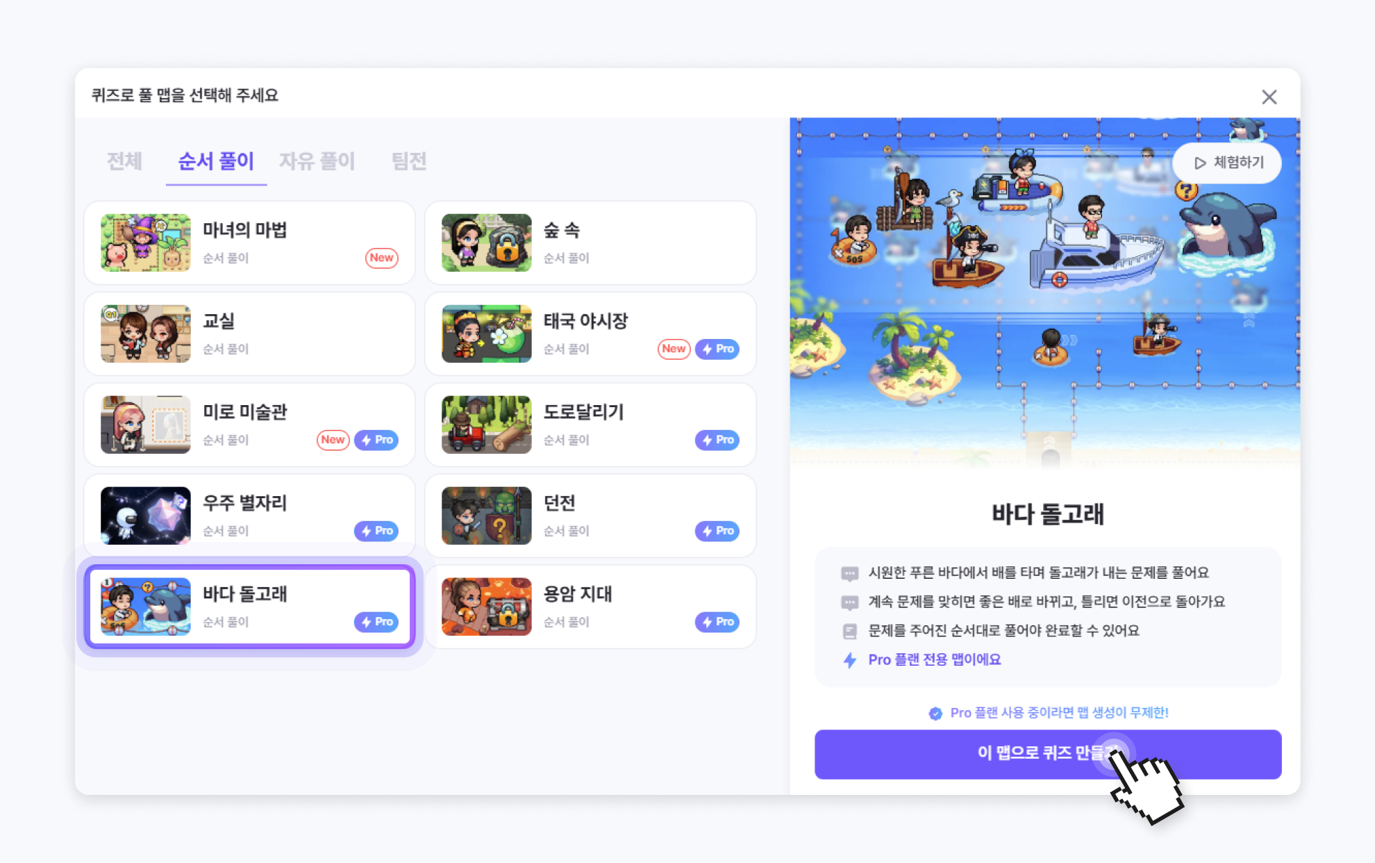 문제의 순서와 상관없이 학생들이 맵 내에서 자유롭게 이동하며 문제를 풀 수 있어요.
