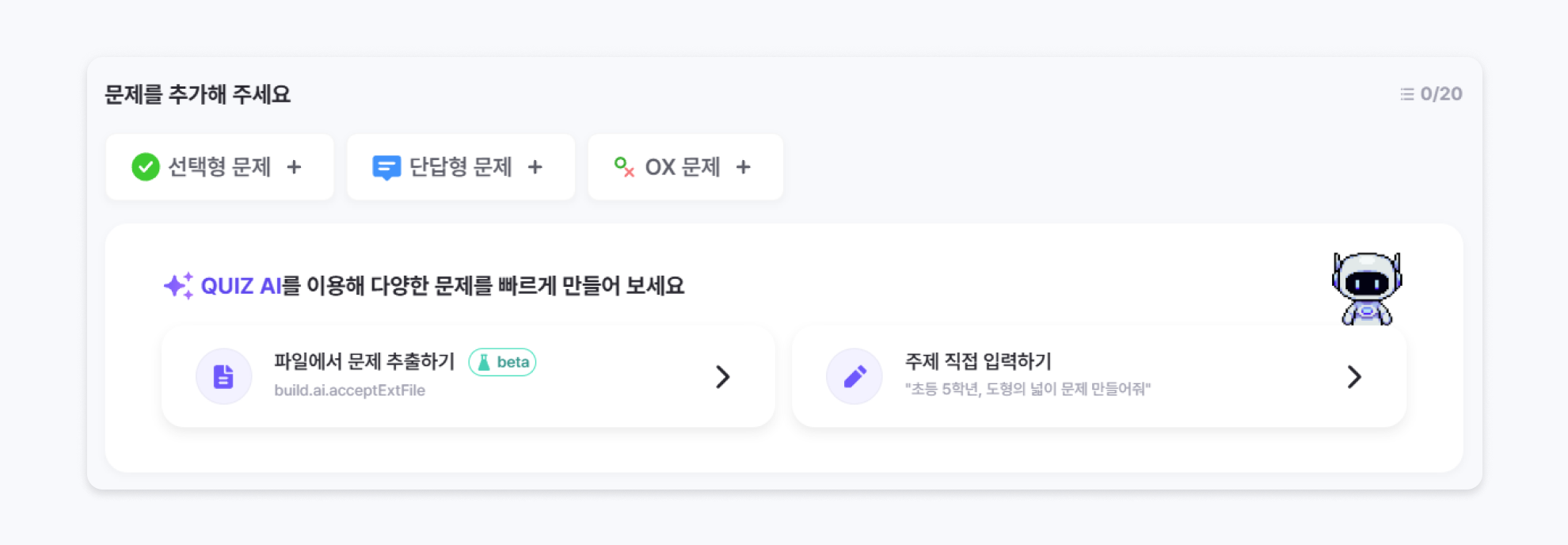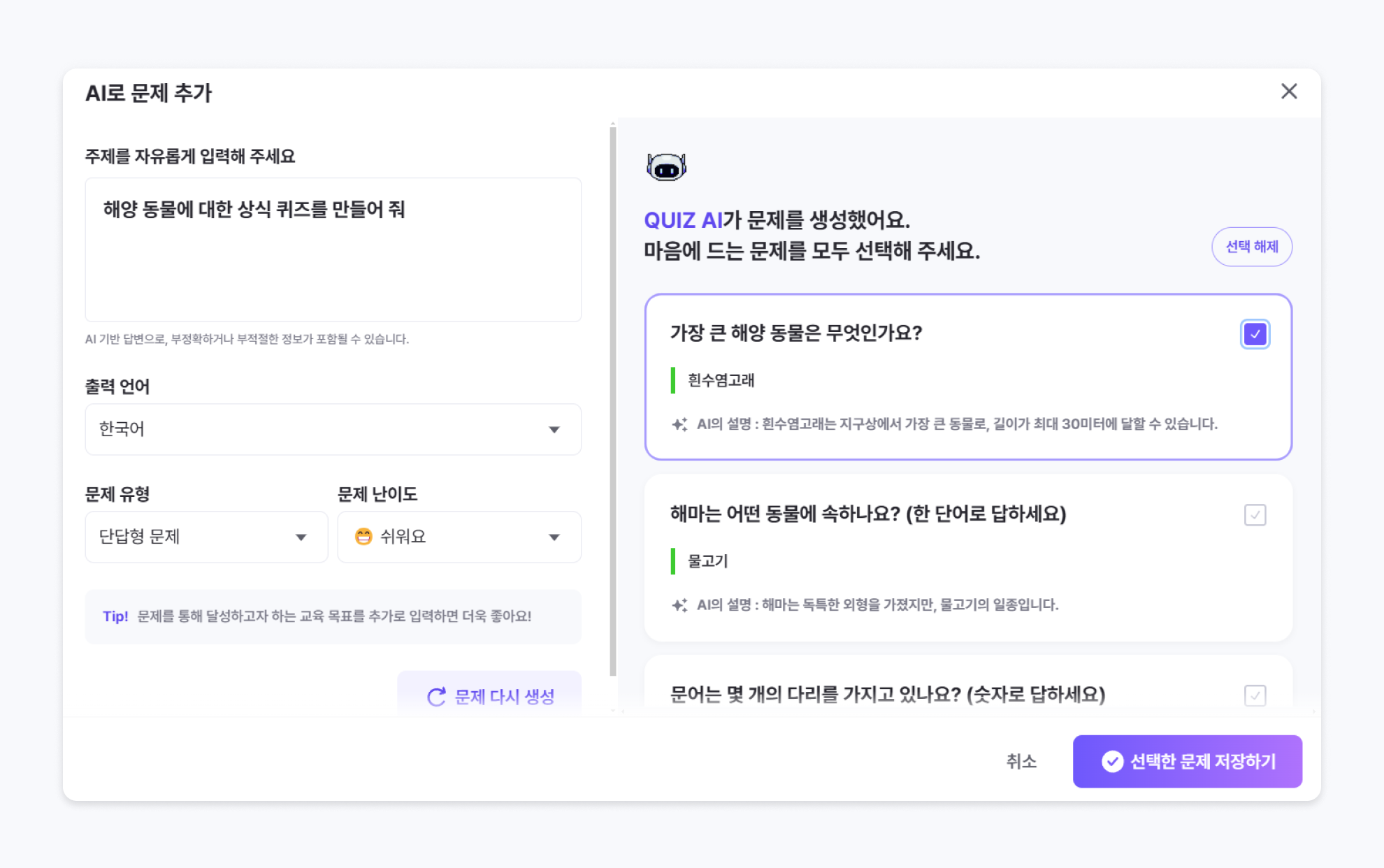 AI로 문제 추가버튼을 클릭해 QUIZ AI로 다양한 문제를 순식간에 만들 수 있어요.