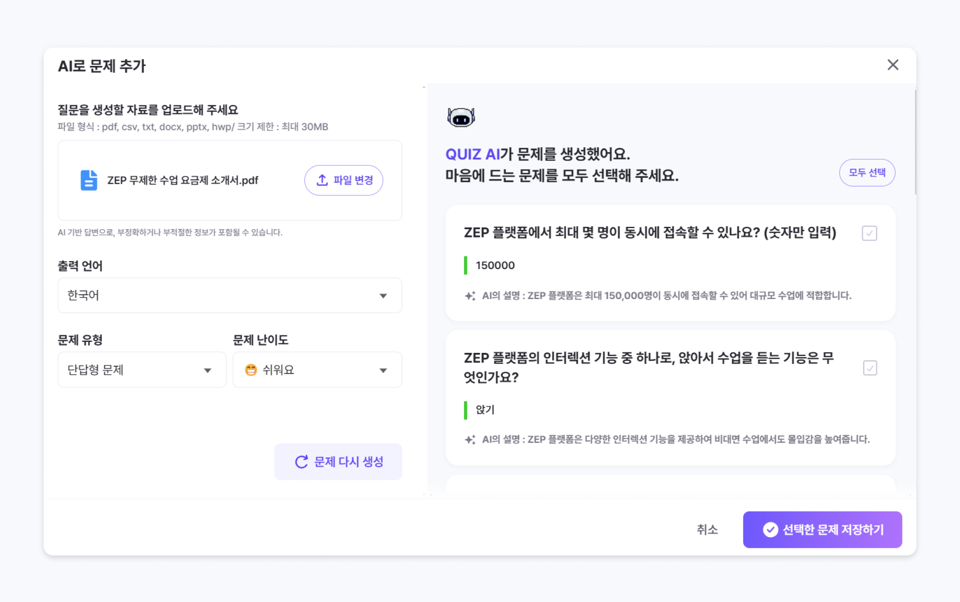 ZEP QUIZ는 최대 20개까지 문제를 추가할 수 있습니다.
