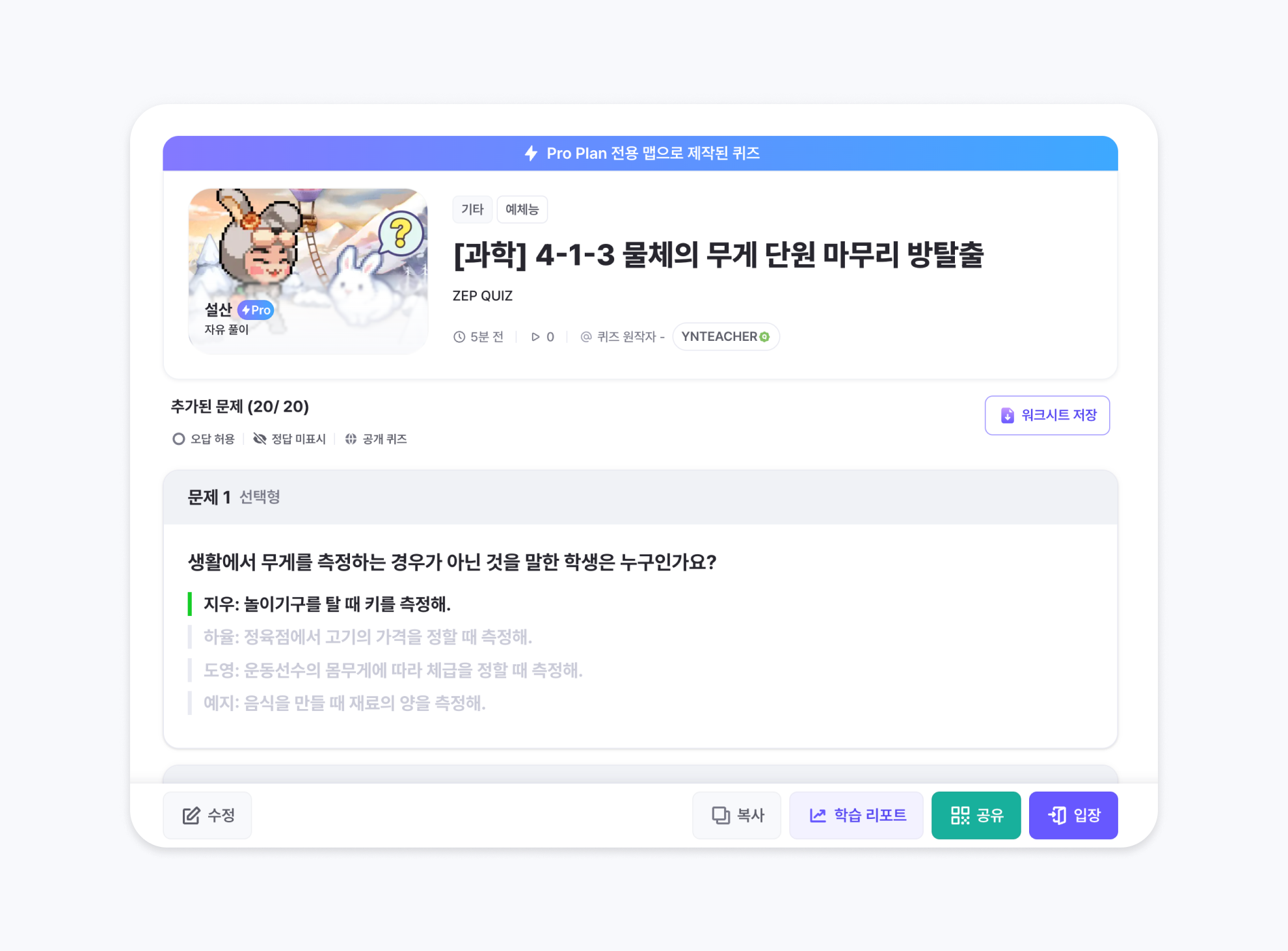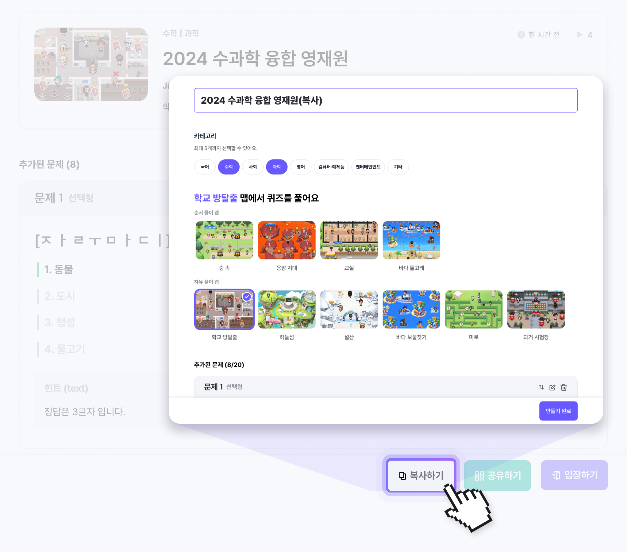 다른 사용자가 제작한 퀴즈를 복사 후 수정하여 빠르게 퀴즈를 만들 수 있습니다.