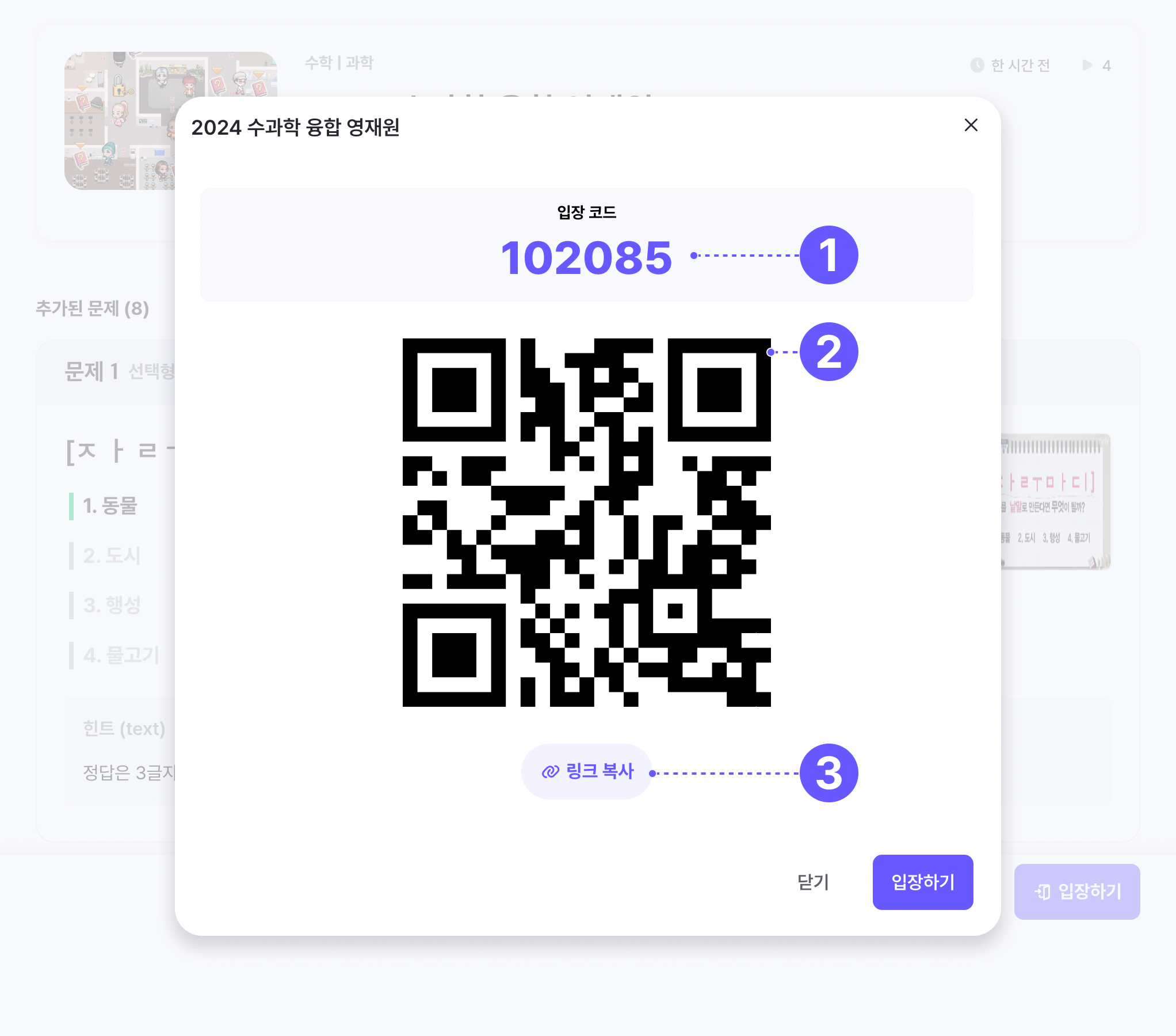 하단에서 공유하기 버튼을 클릭하여 퀴즈의 입장코드(1), QR코드(2), 퀴즈 링크(3)를 공유할 수 있습니다.