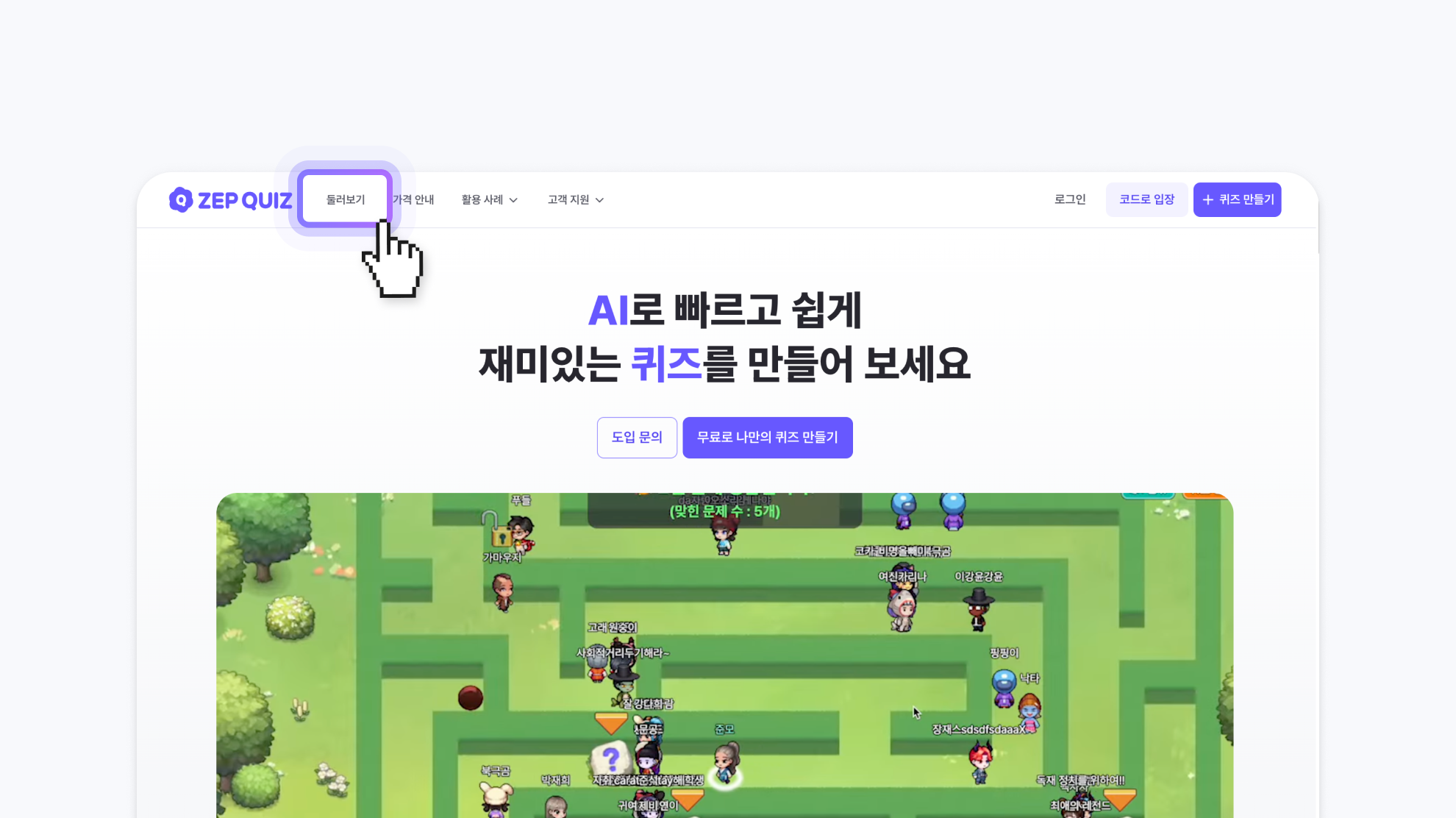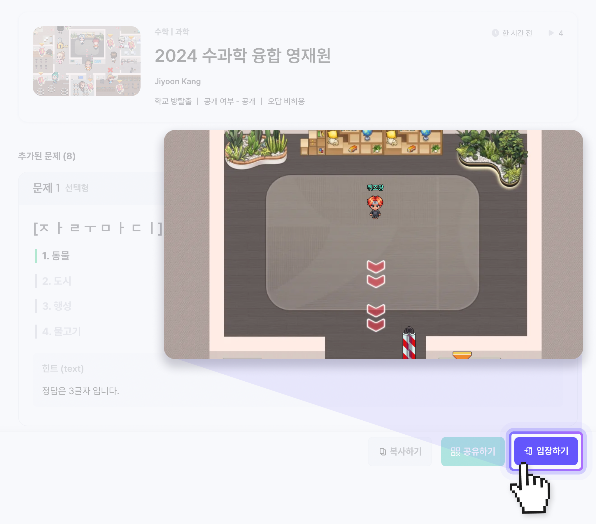 입장하기 버튼을 클릭하고 다른 사람이 만든 퀴즈룸에 들어가 맵을 둘러보세요.