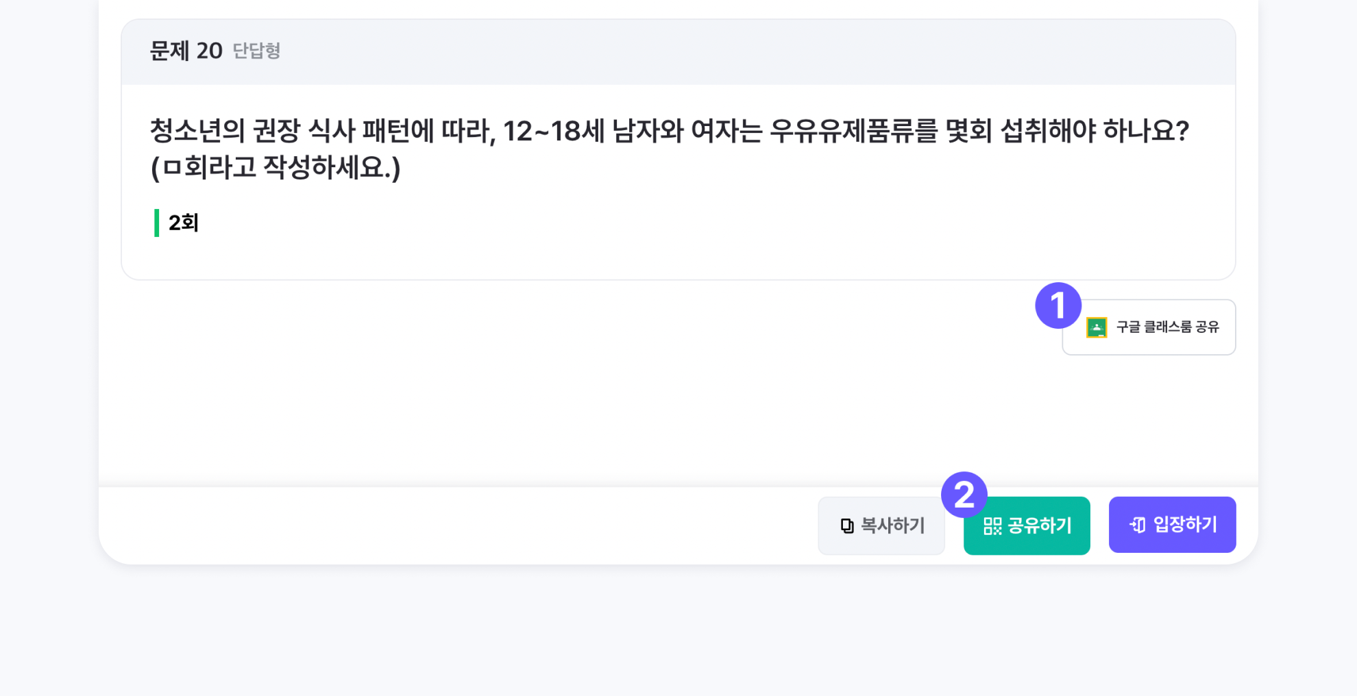 퀴즈 상세 페이지에서 구글 클래스룸 공유 버튼을 클릭하여 원하는 수업에 해당 퀴즈를 공유할 수 있습니다.