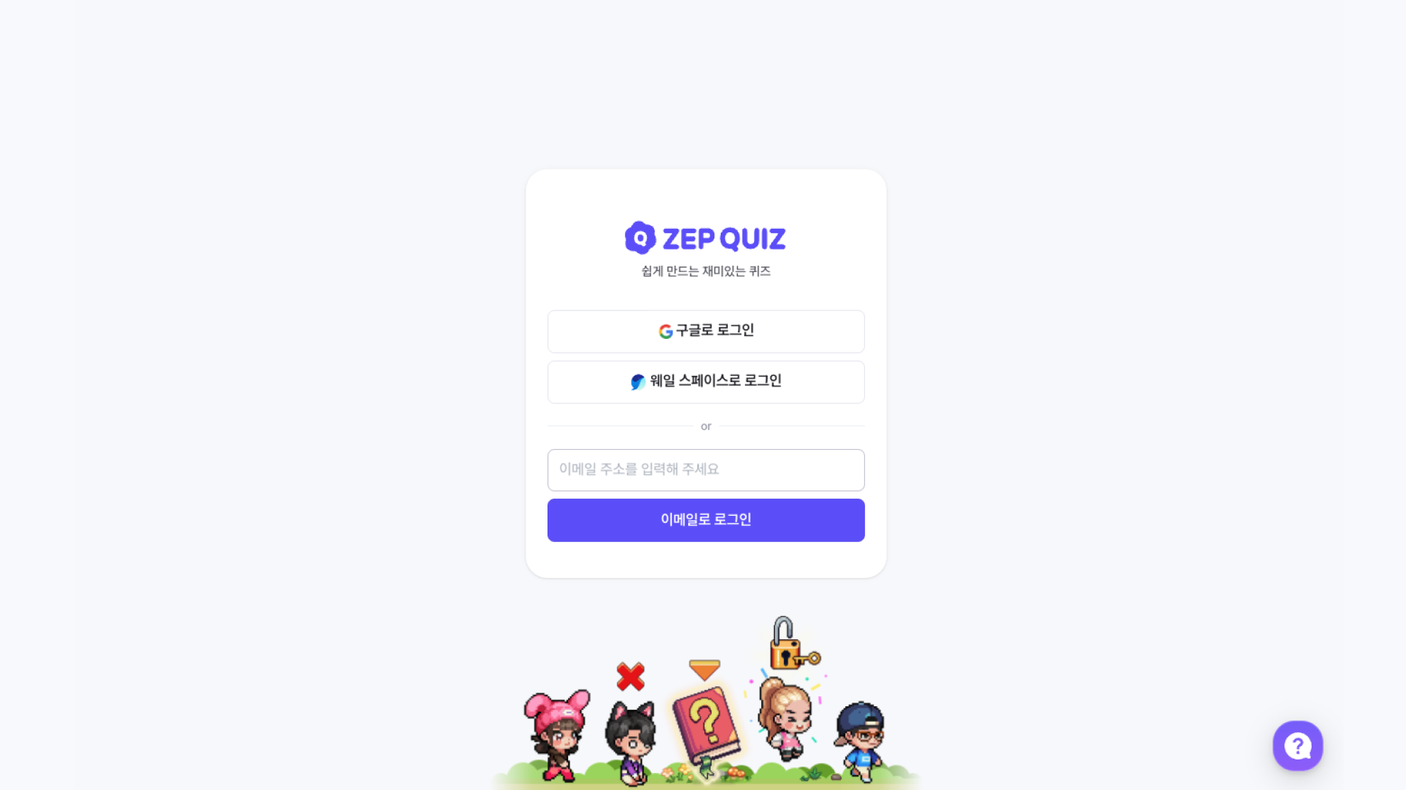 퀴즈 맵에 입장해서 퀴즈만 풀고 싶다면 로그인 없이도 참여가 가능해요.