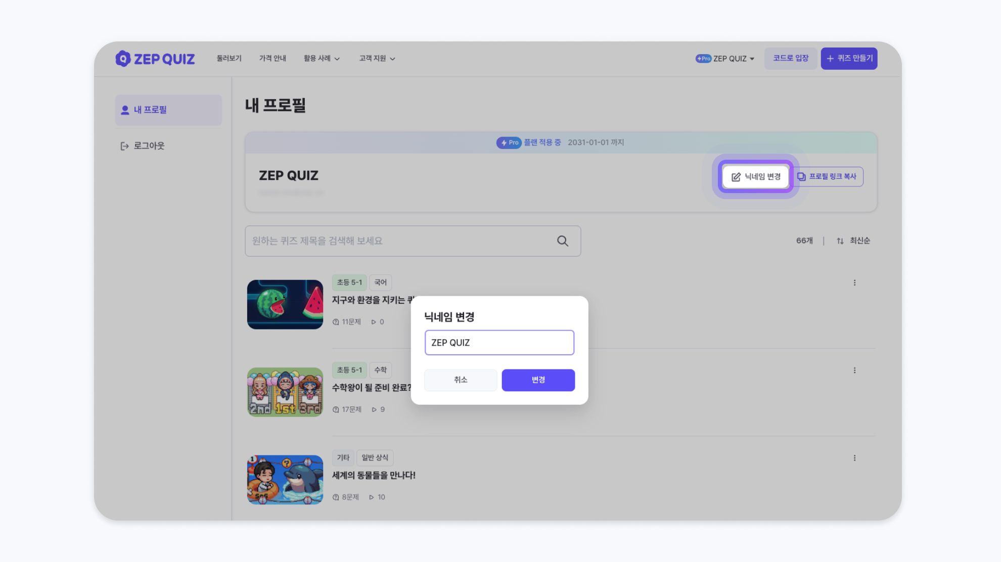 퀴즈맵에서 내 프로필을 클릭하면 프로필 수정 팝업이 나타납니다.