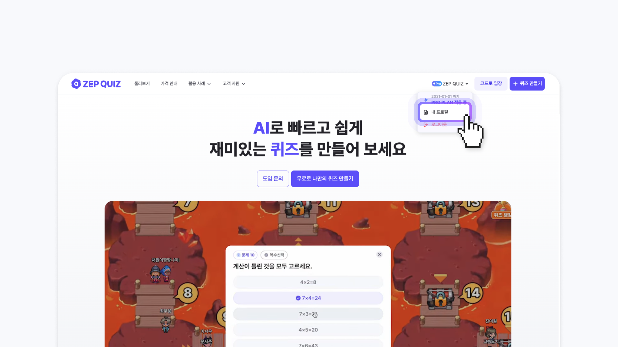 ZEP QUIZ는 클릭 몇 번으로 재미있는 방탈출 퀴즈를 만들 수 있는 에듀테크 퀴즈 플랫폼입니다.