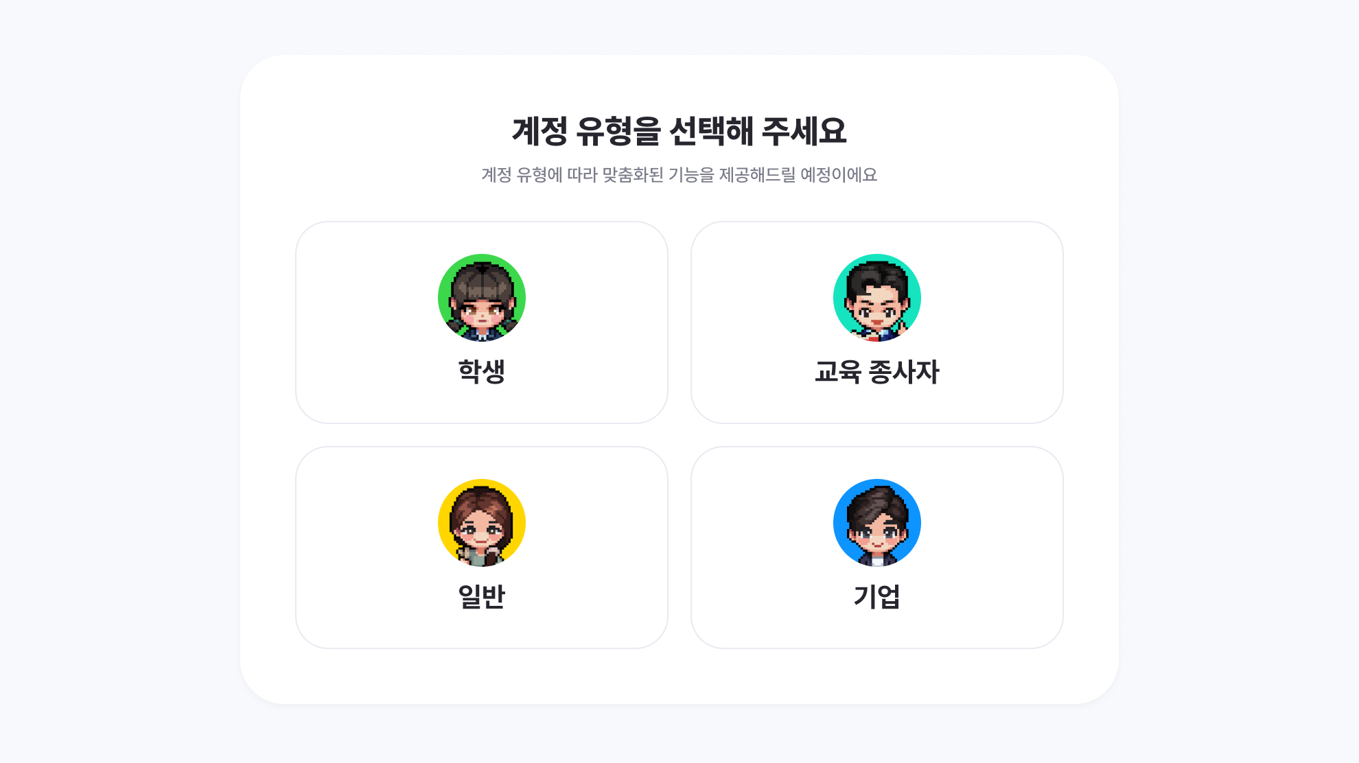 처음 로그인을 하신다면, 학생, 선생님, 일반, 기업 중 본인이 해당하는 유형을 선택해 주세요.