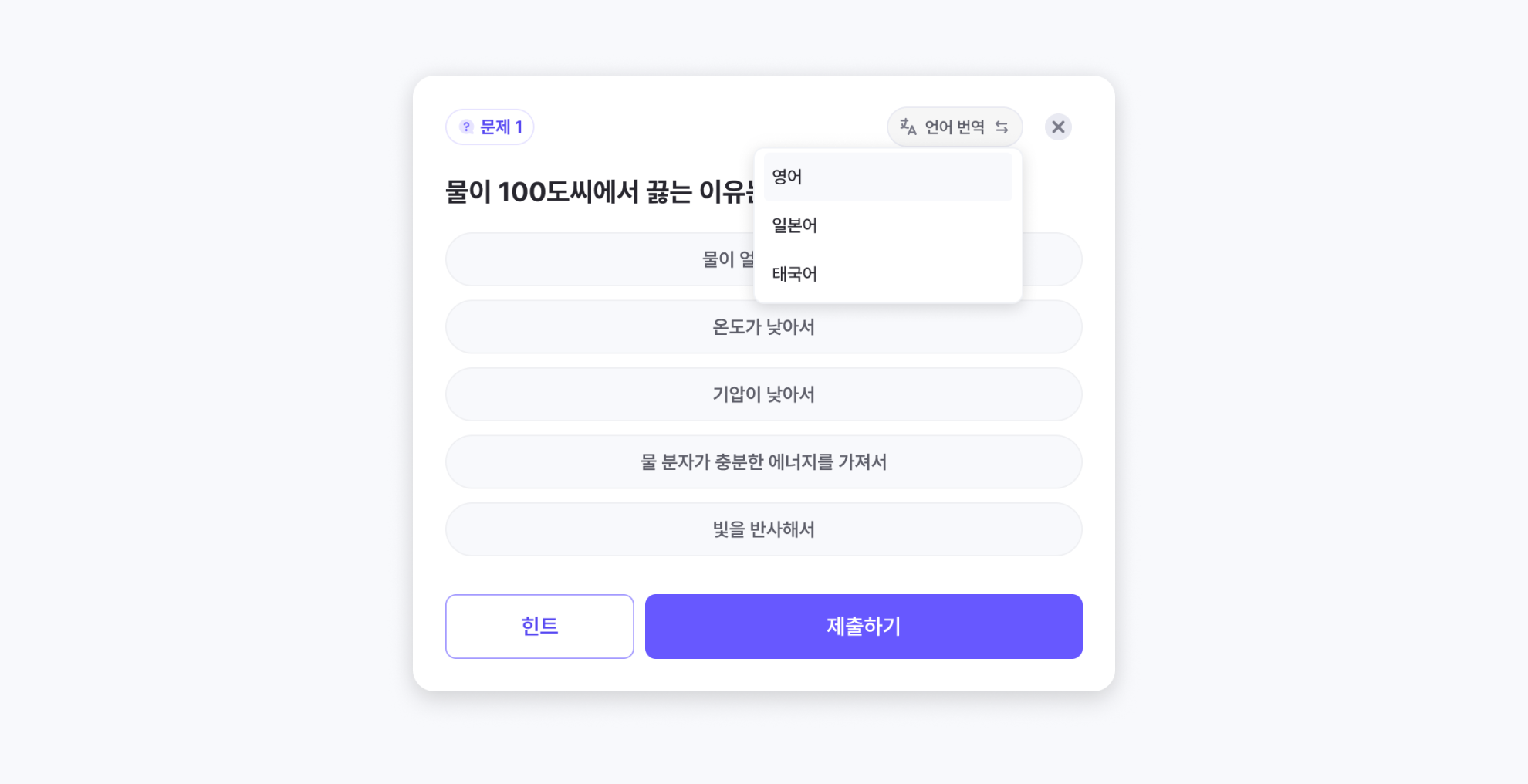 선택한 언어에 따라 문제 내용이 AI로 자동 번역되어 바로 적용돼요.