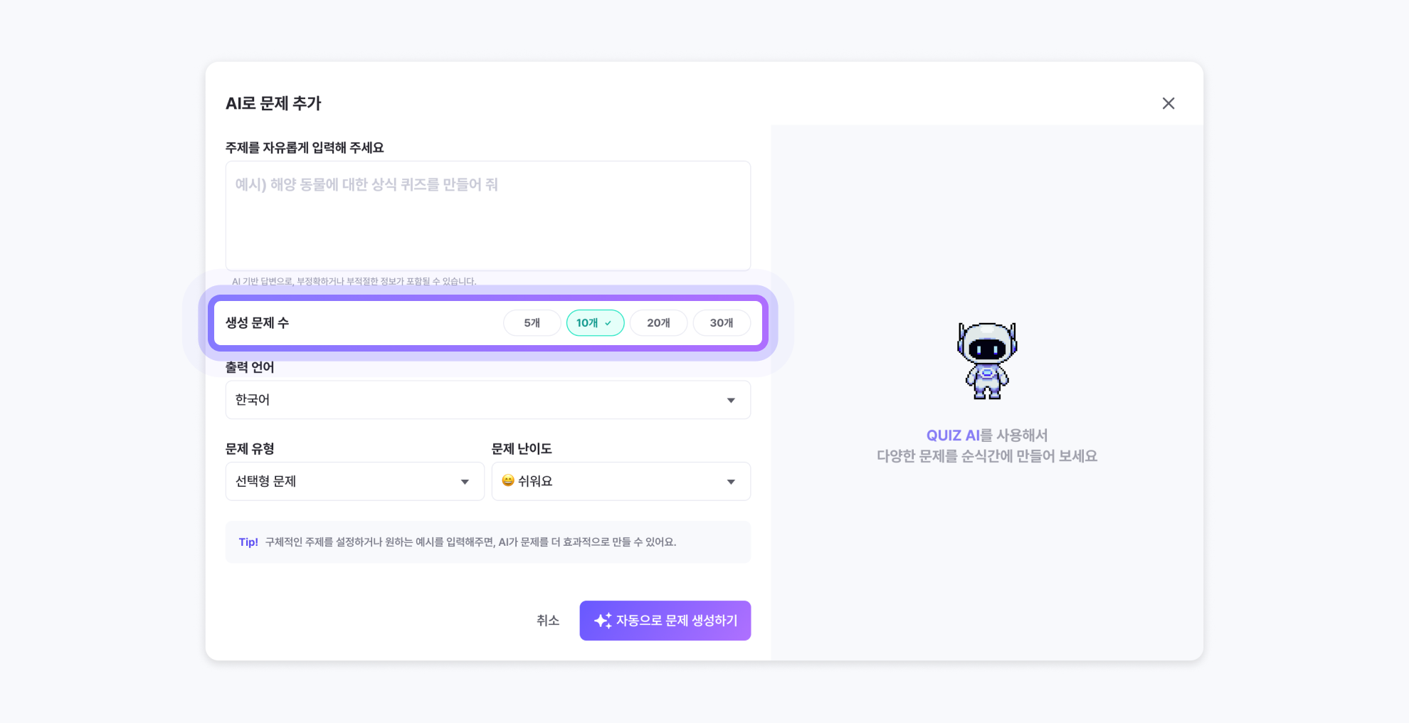 이제 AI 문제 만들기에서 생성할 문제 개수를 직접 선택할 수 있어요!