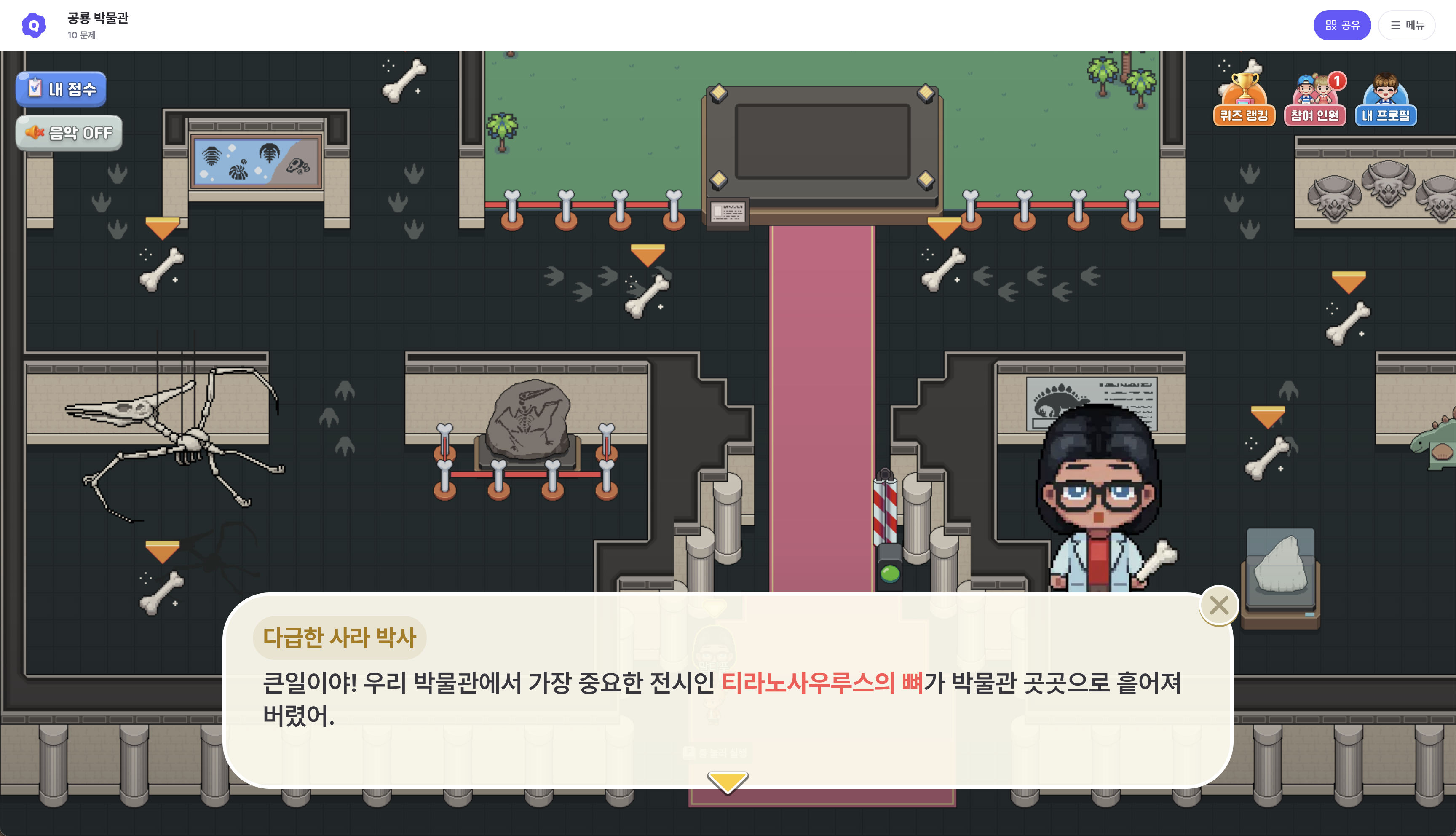 퀴즈를 풀며 단서를 모아, 사라진 뼈를 다시 찾아주세요.