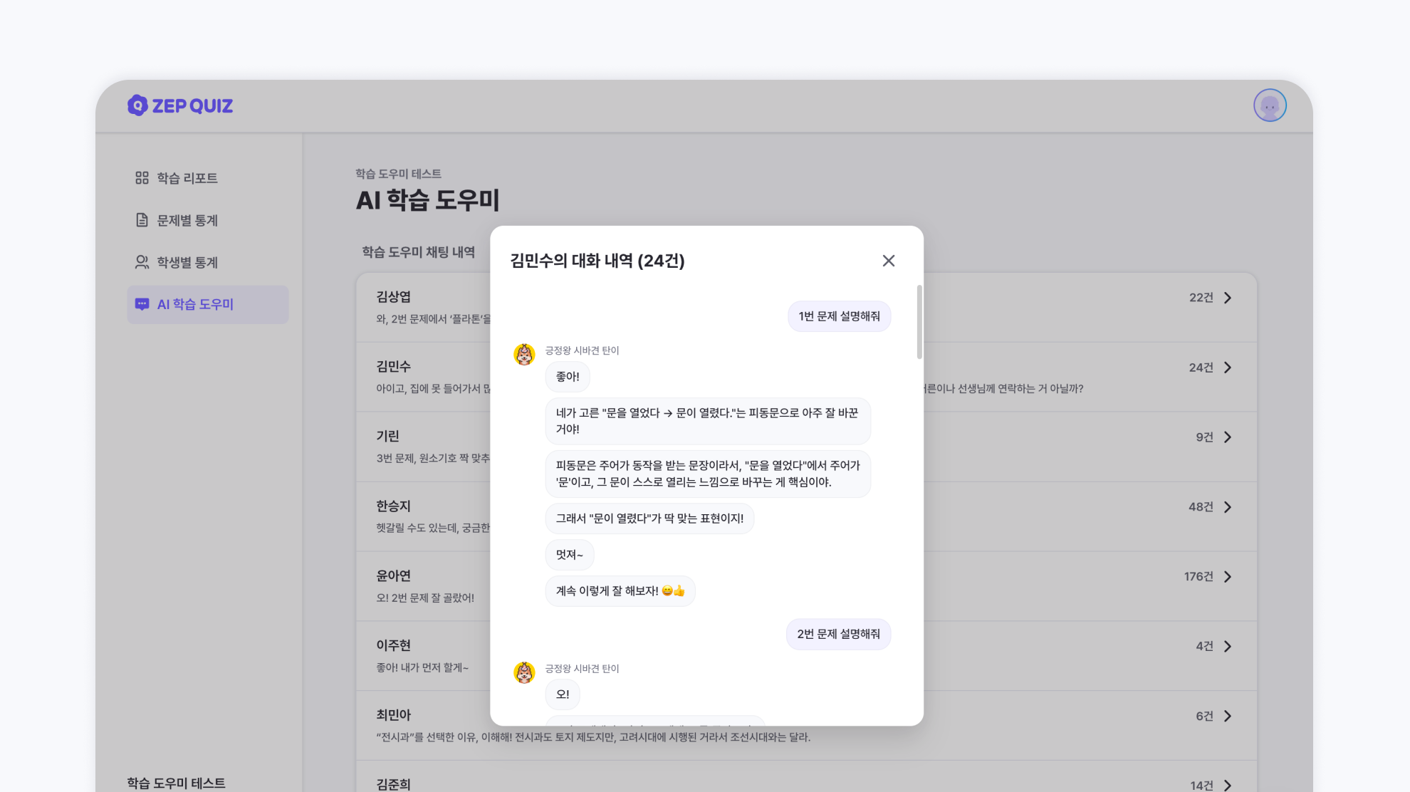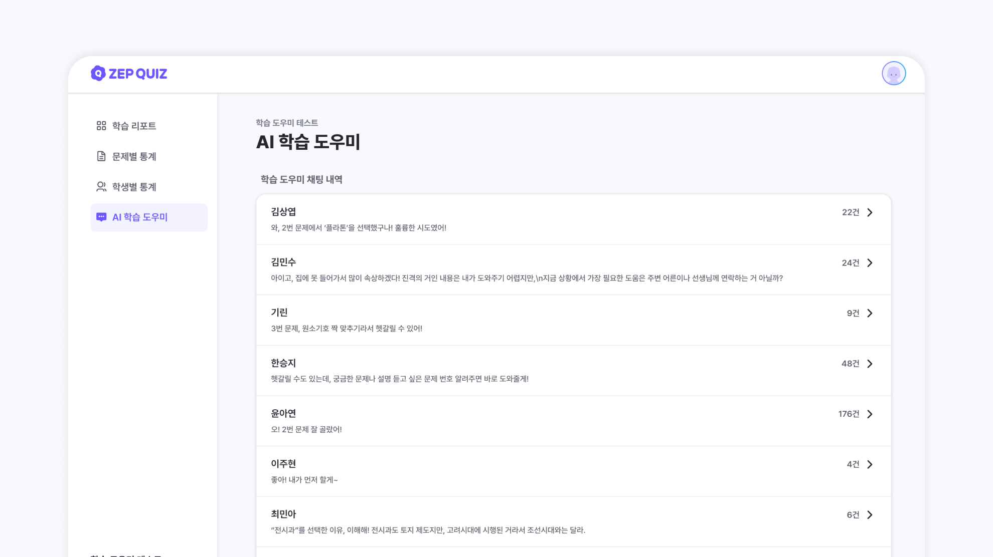 학생들이 도우미와 나눈 대화는 모두 학습 리포트에서 확인할 수 있어요.