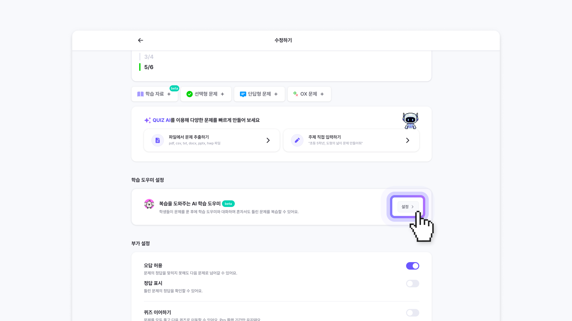 퀴즈 생성 또는 수정 > 학습 도우미 설정 > 학습 도우미 선택