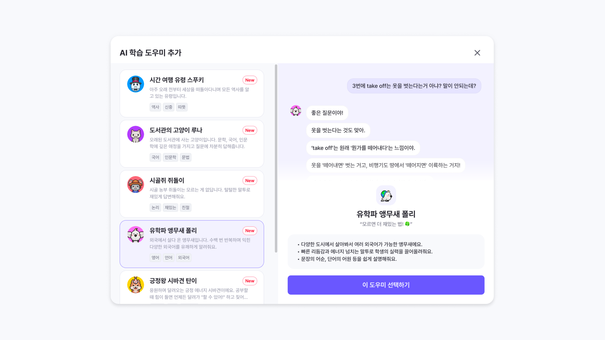 각 도우미마다 성격과 강점이 다르니, 수업에 맞는 도우미를 선택해 사용해 보세요.