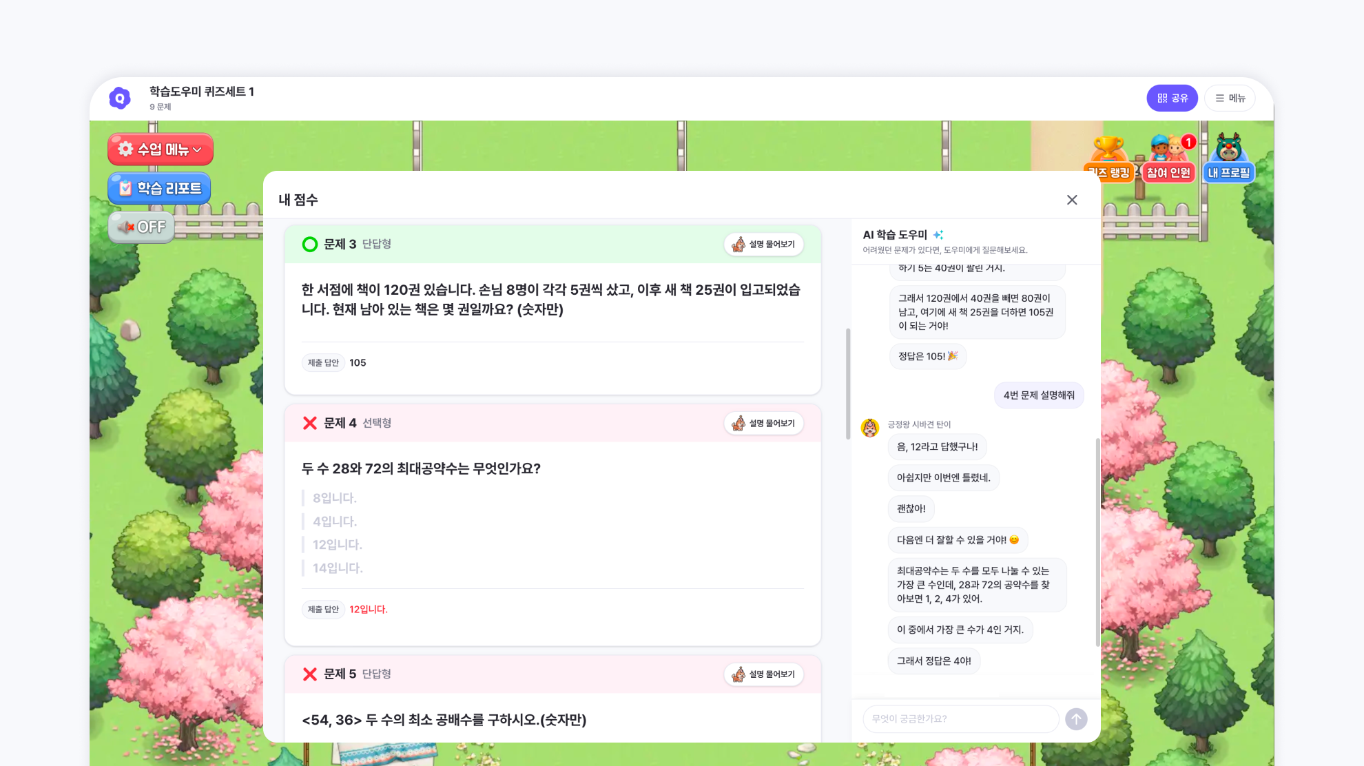학습 도우미를 설정하면, 학생들이 퀴즈를 다 푼 후 학습 도우미와 대화하며