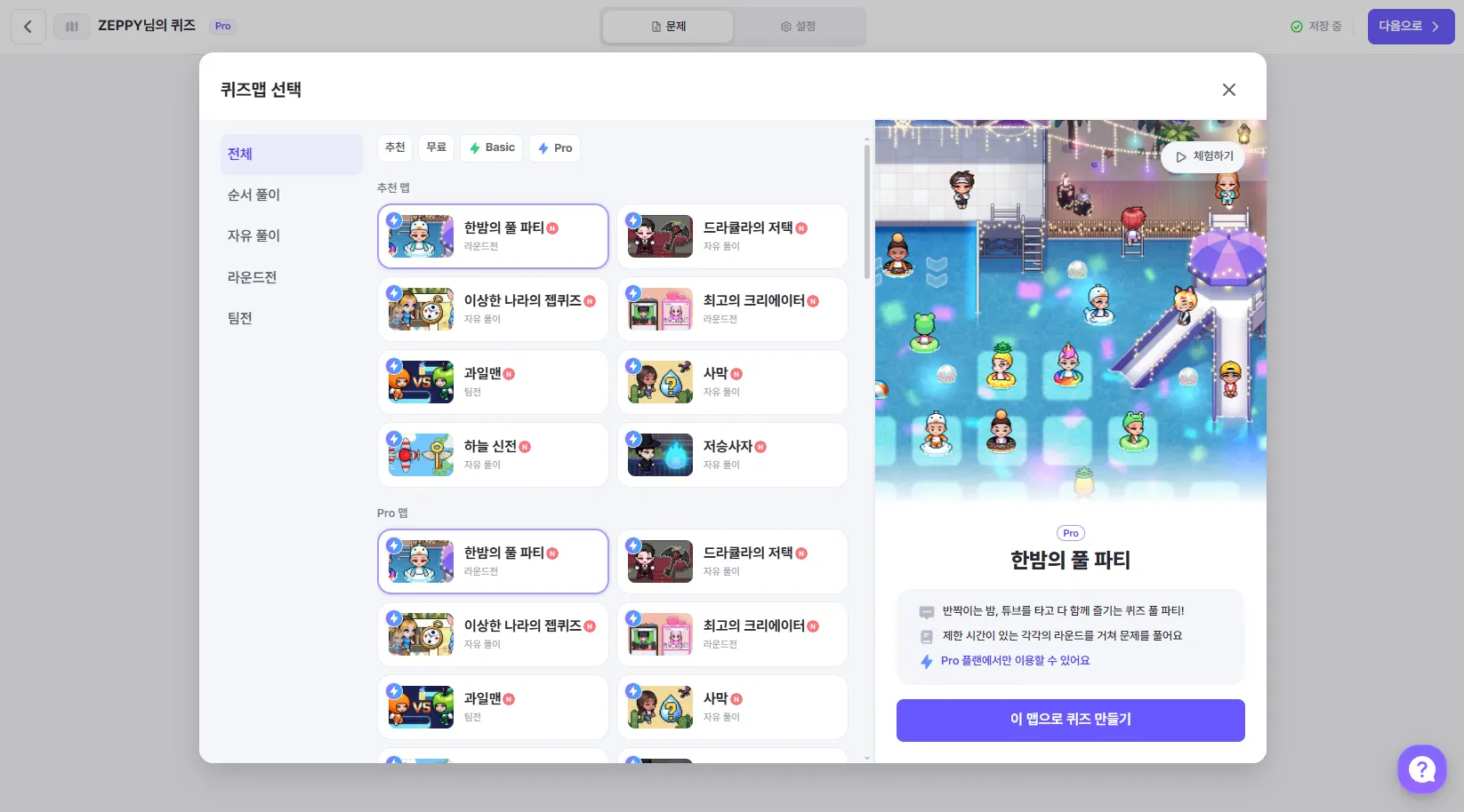 퀴즈맵 선택 화면에서 각각 맵들의 플랜 정보를 확인할 수 있어요.