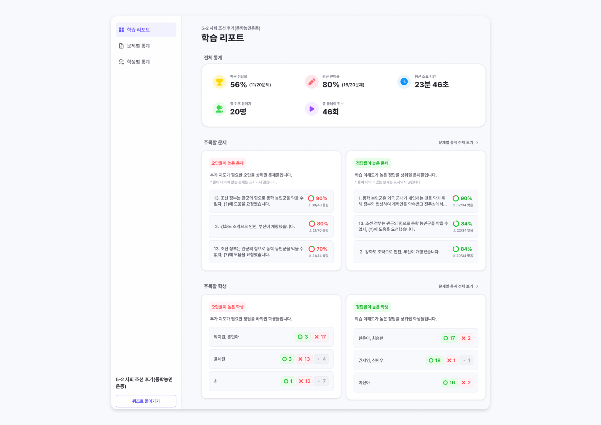 퀴즈 풀이 인원, 풀이 횟수, 평균 정답률, 진행률, 소요 시간을 한눈에 확인할 수 있습니다.