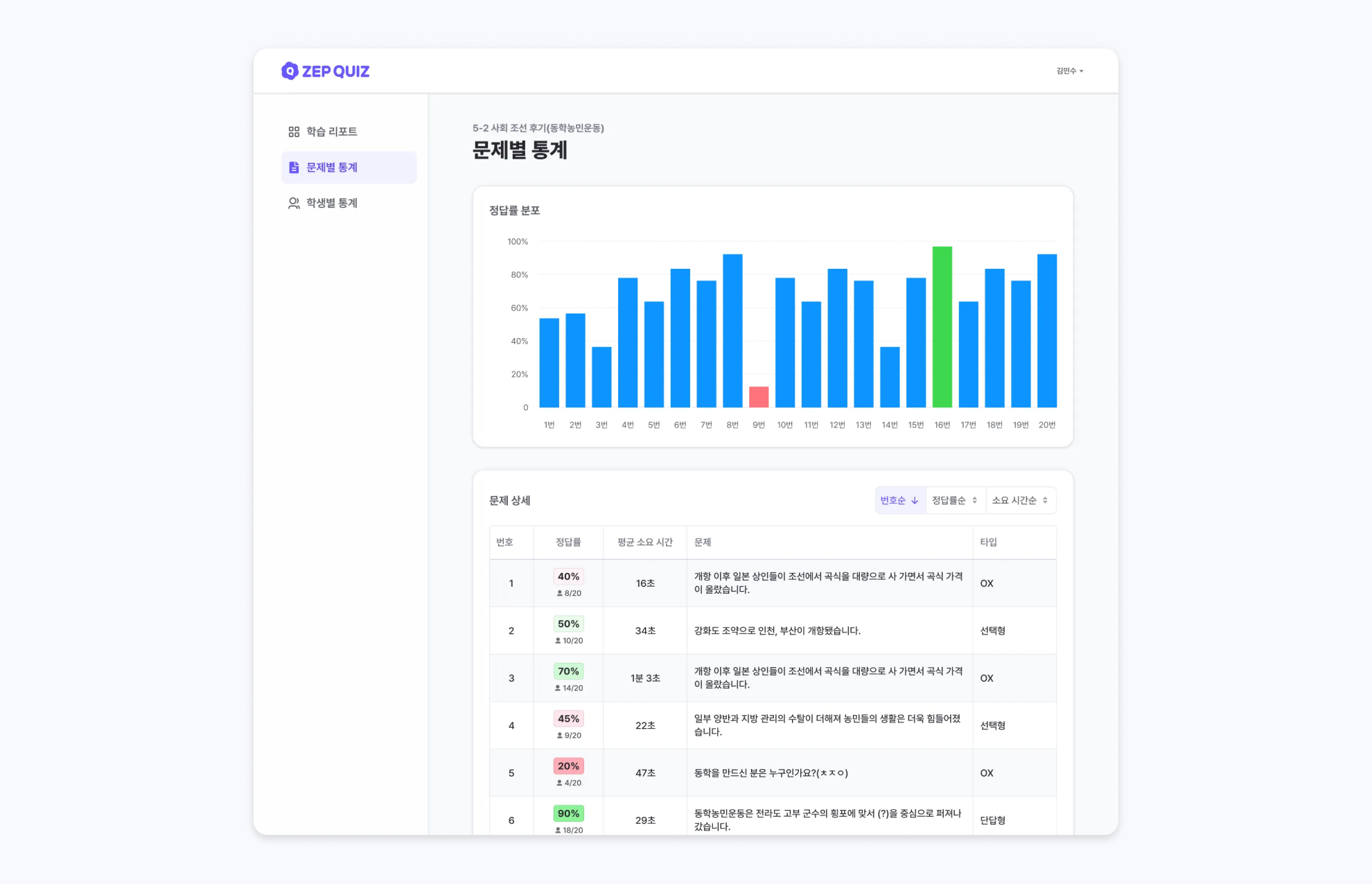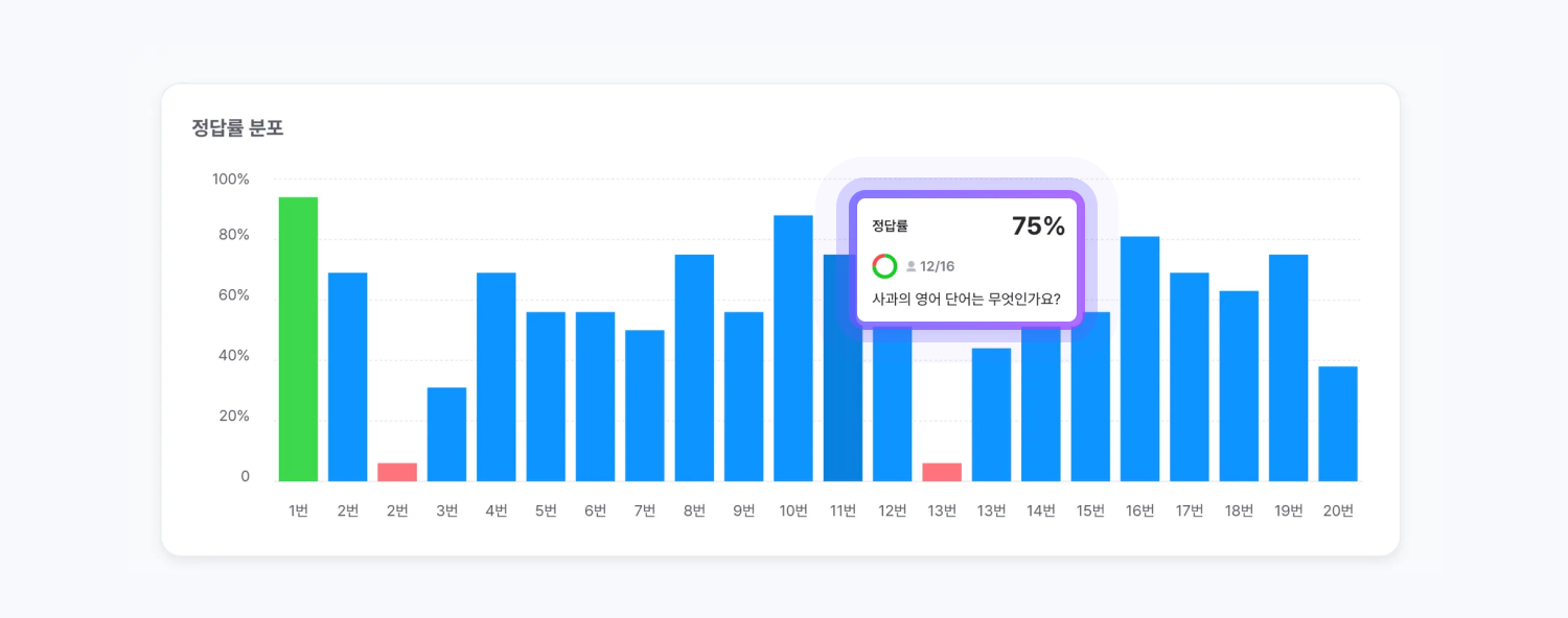 문제별 정답률을 한눈에 확인해보세요.