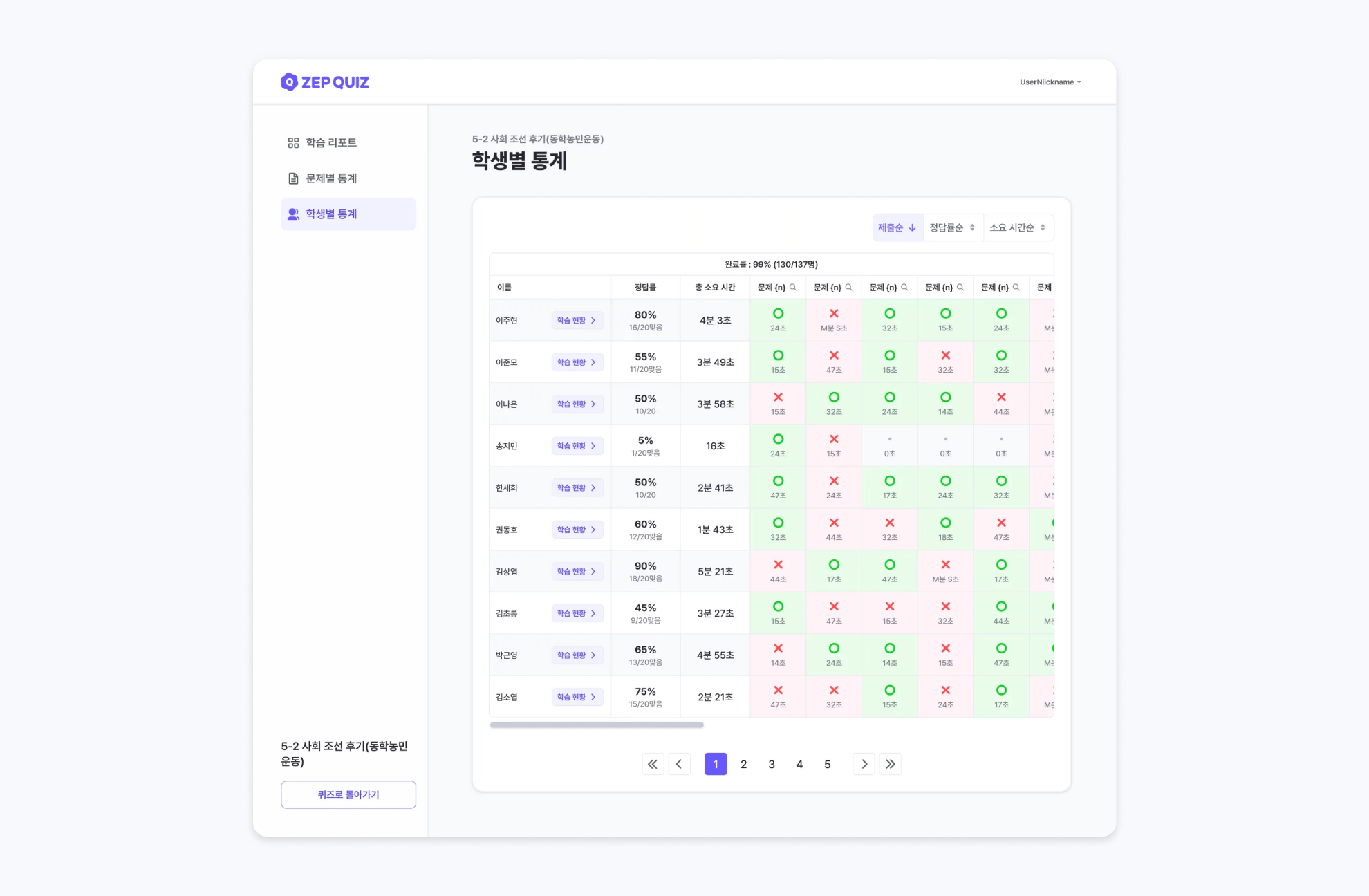 각 학생의 개별 정답률, 진행률, 소요 시간을 확인할 수 있습니다.