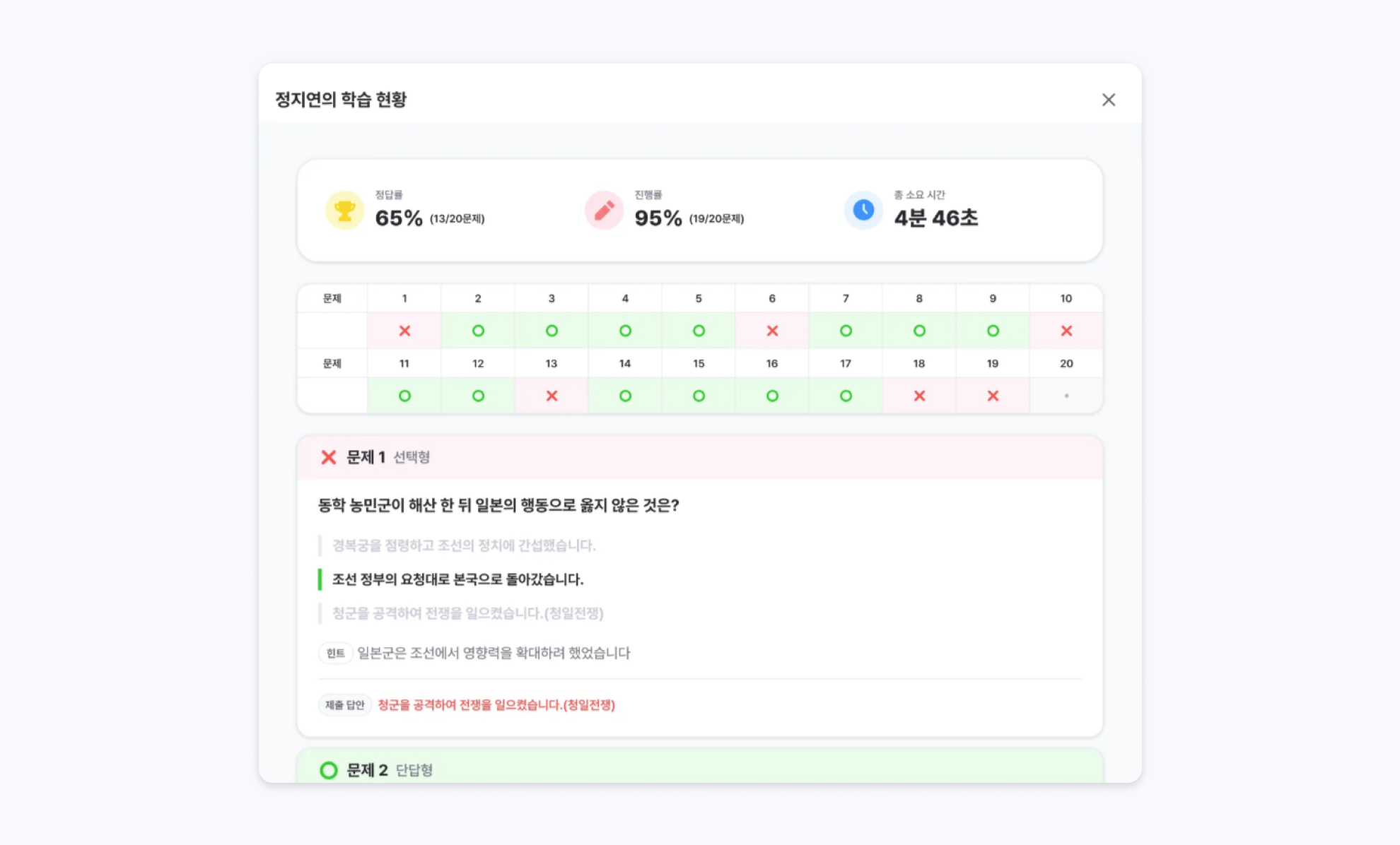 문제별 오답을 한눈에 확인할 수 있습니다.