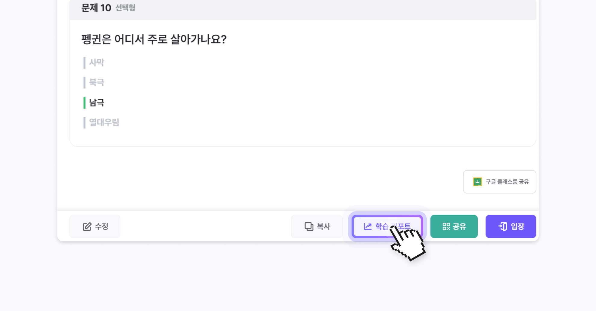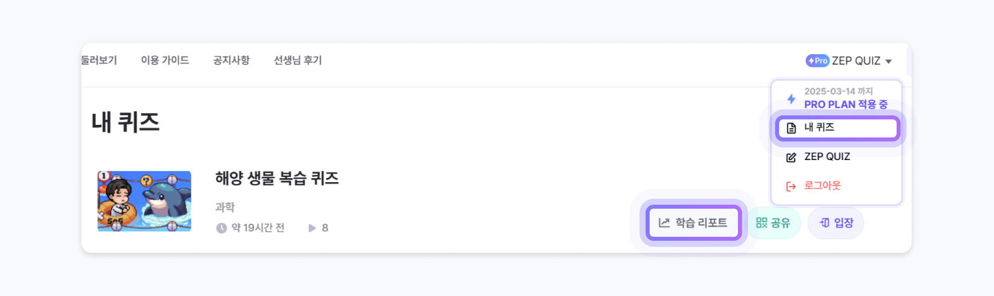 내 퀴즈 목록에서 확인하려는 퀴즈의 '학습 리포트' 버튼을 클릭하세요.