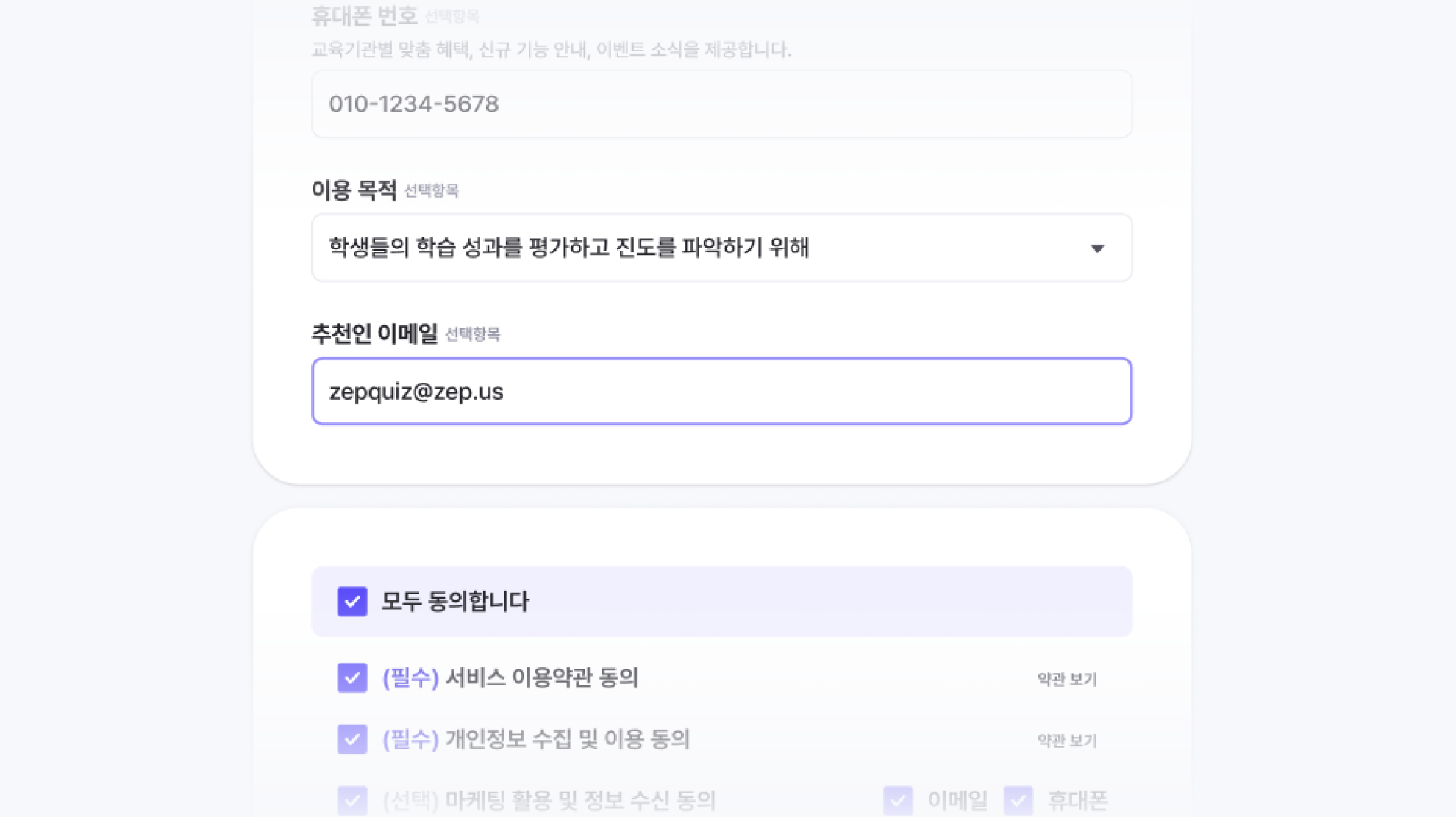 동료 선생님이 가입할 때 내 계정을 추천인으로 입력하면, 추천한 선생님께 젭 퀴즈 프로 플랜 2주 무료 이용권이 제공됩니다.