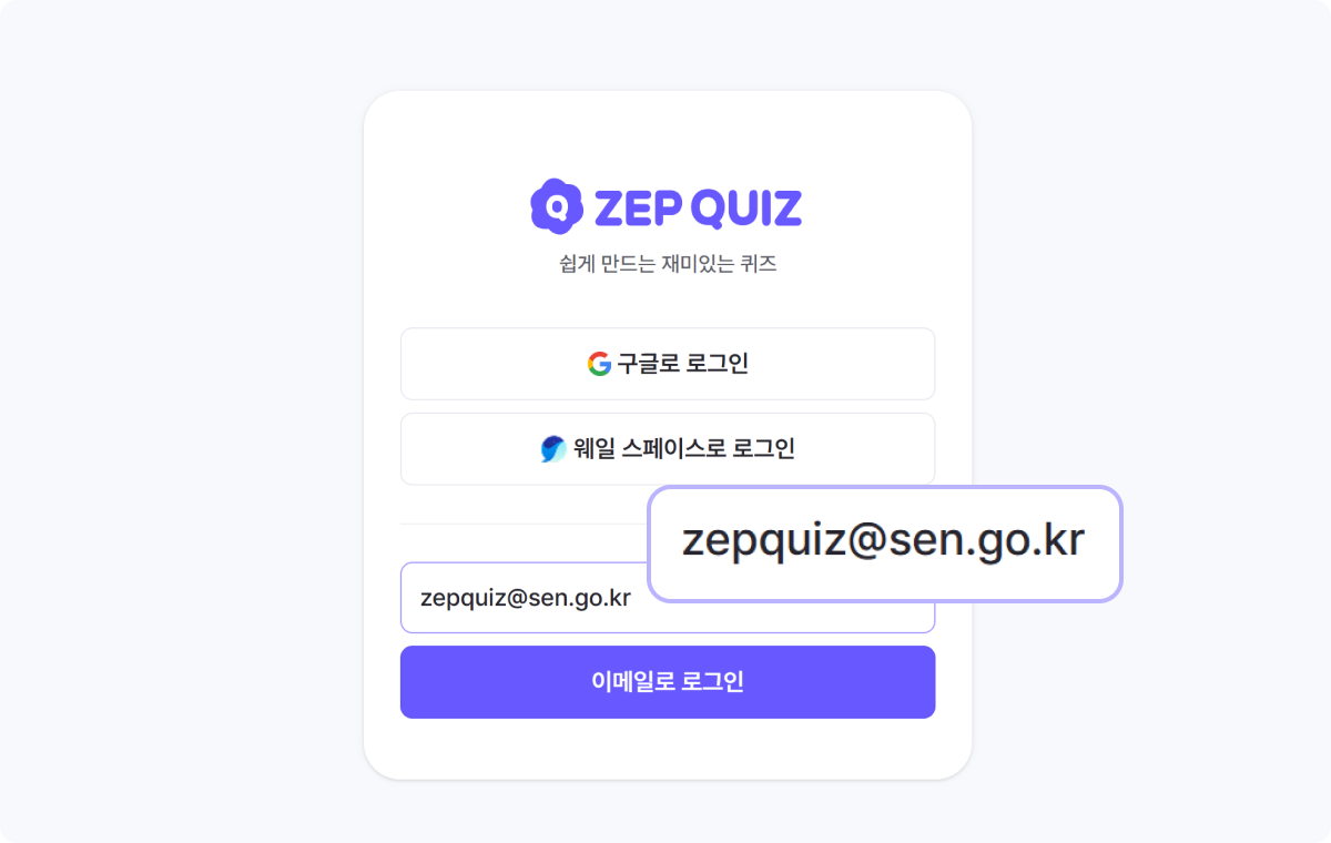 ZEP QUIZ에 본 이벤트를 통해 @sen.go.kr 이메일로 신규 가입