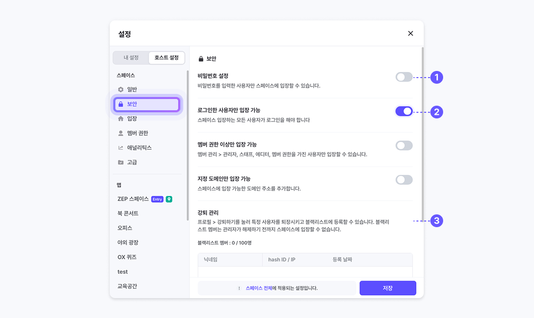 로그인한 사용자만 입장 가능하도록 하면 로그인 기록을 기반으로 스페이스 내 활동을 추적할 수 있습니다.