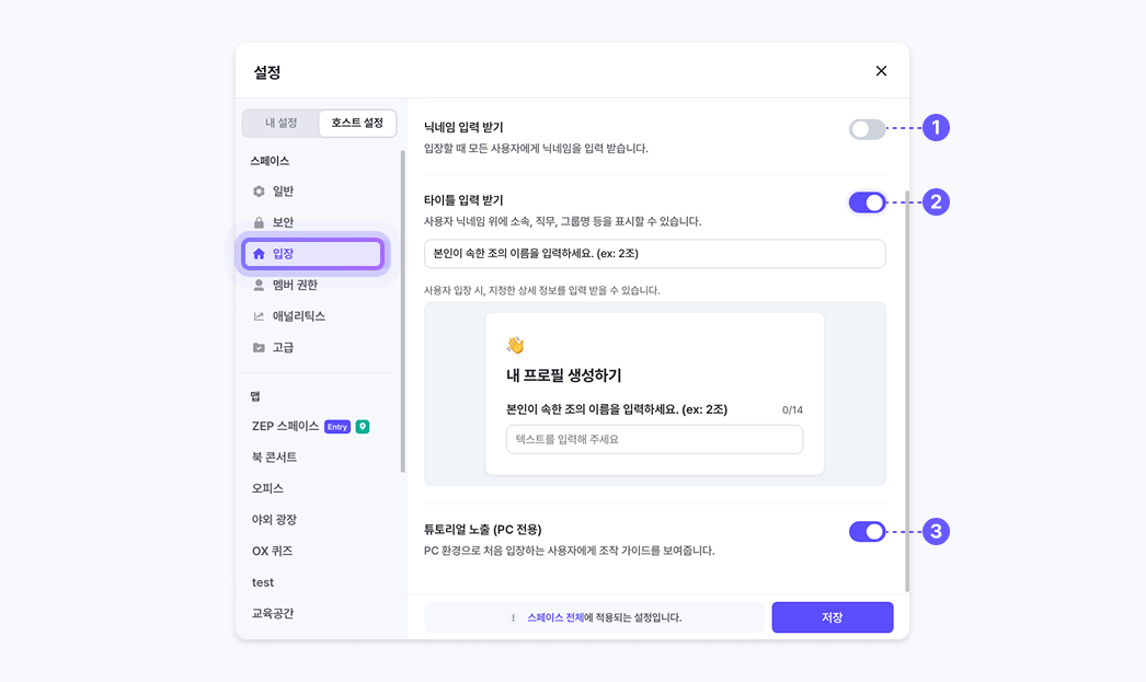 스페이스에 입장할 때 닉네임을 입력하도록 설정하는 기능입니다.