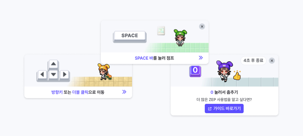 ZEP을 PC에서 처음 사용하는 사용자에게 조작 가이드를 제공하는 기능입니다.