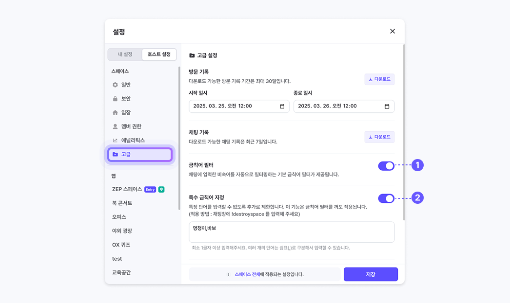 기본 금칙어 필터 외에도, 개별 스페이스에서 특정 금칙어를 추가로 지정할 수 있습니다.