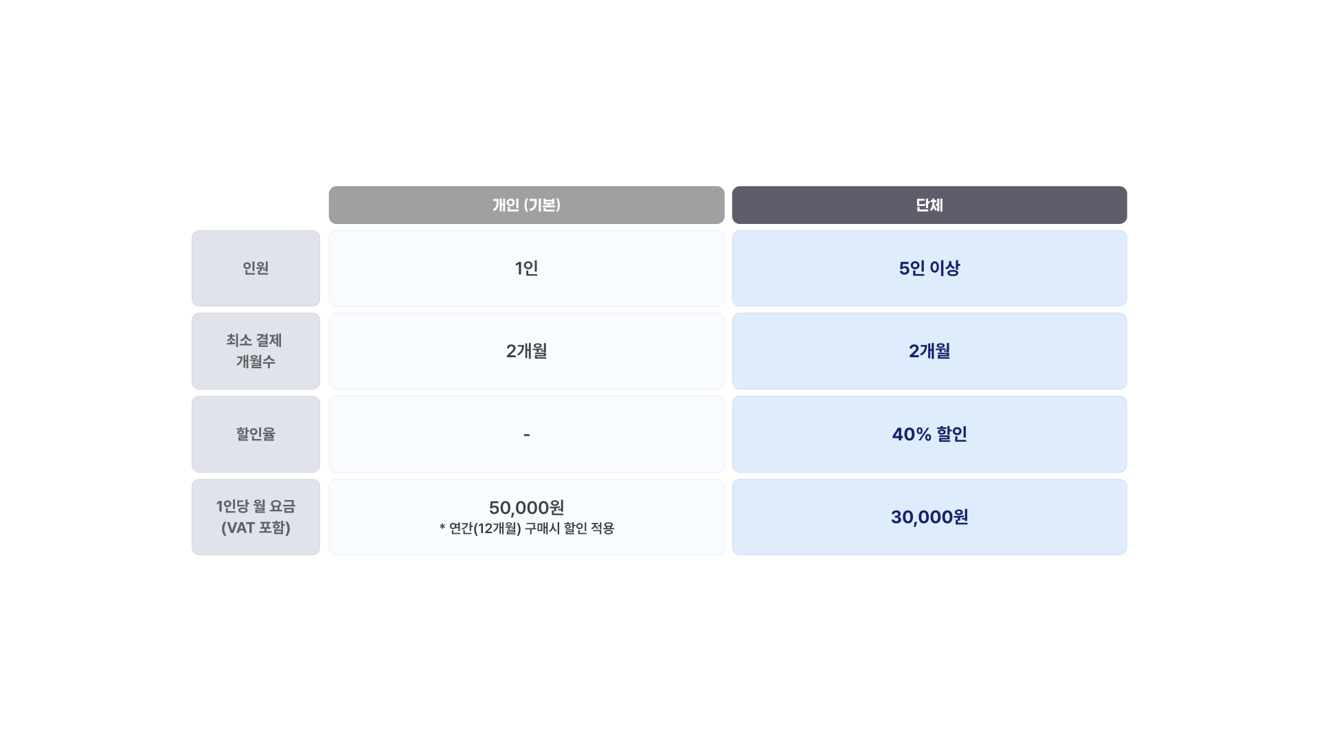 단체: 5인 이상 구매시 1인당 월 요금50,000원→ 30,000원 으로 할인